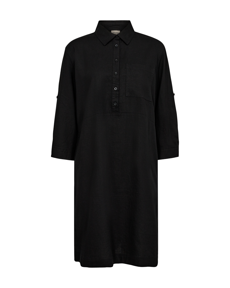 Kjole fra Freequent i lett stoff. Kjolen er enkel i designet med trekvart ermer, knappelukking foran, klassisk krage samt løs passform. Ermene kan brettes opp og festes med knapp. Se bildet forskjell.