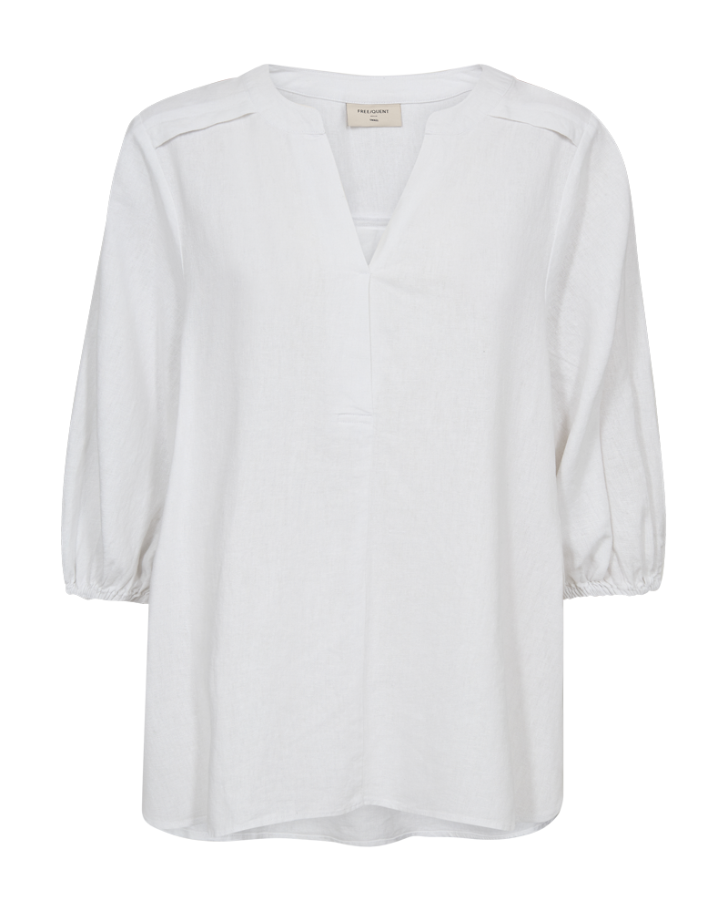 Bluse fra Frequent i et lett materiale. Blusen er enkel i designet med korte ermer, V-hals, liten mandarinkrage, folder ved skuldrene samt løs passform.