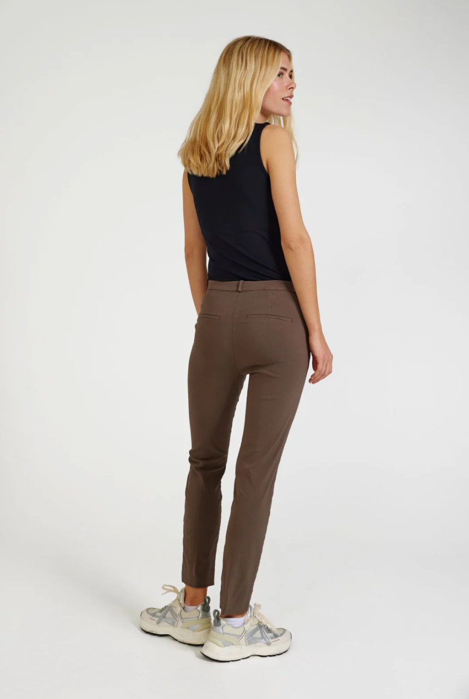 Bestselger bukse fra Freequent i en deilig kvalitet. Buksen er enkel i designet med sidelommer, knapp og glidelåslukking foran og en tettsittende passform. Beltestropper og splitt nede i siden ved ankelen