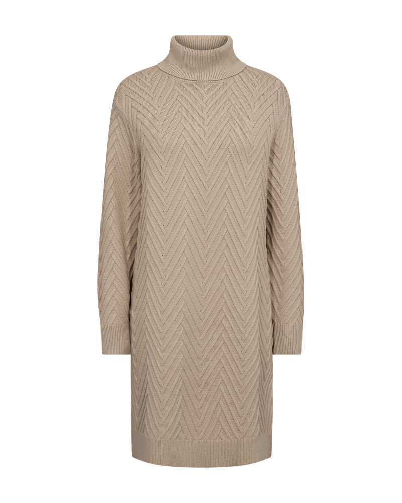 Herlig strikkekjole fra Freequent i et mykt, strikket materiale og med et nydelig, strukturert mønster. Kjolen har en enkel silhuett med hals, ribbekant og lange ermer.