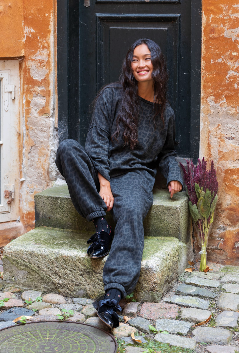 Myk og avslappet joggebukse med børstet innside. Buksene kommer i ett lult leo print. Leo print vil du se mer og mer av fremover. Litt stor i størrelsen og elastisk nederst på bena.