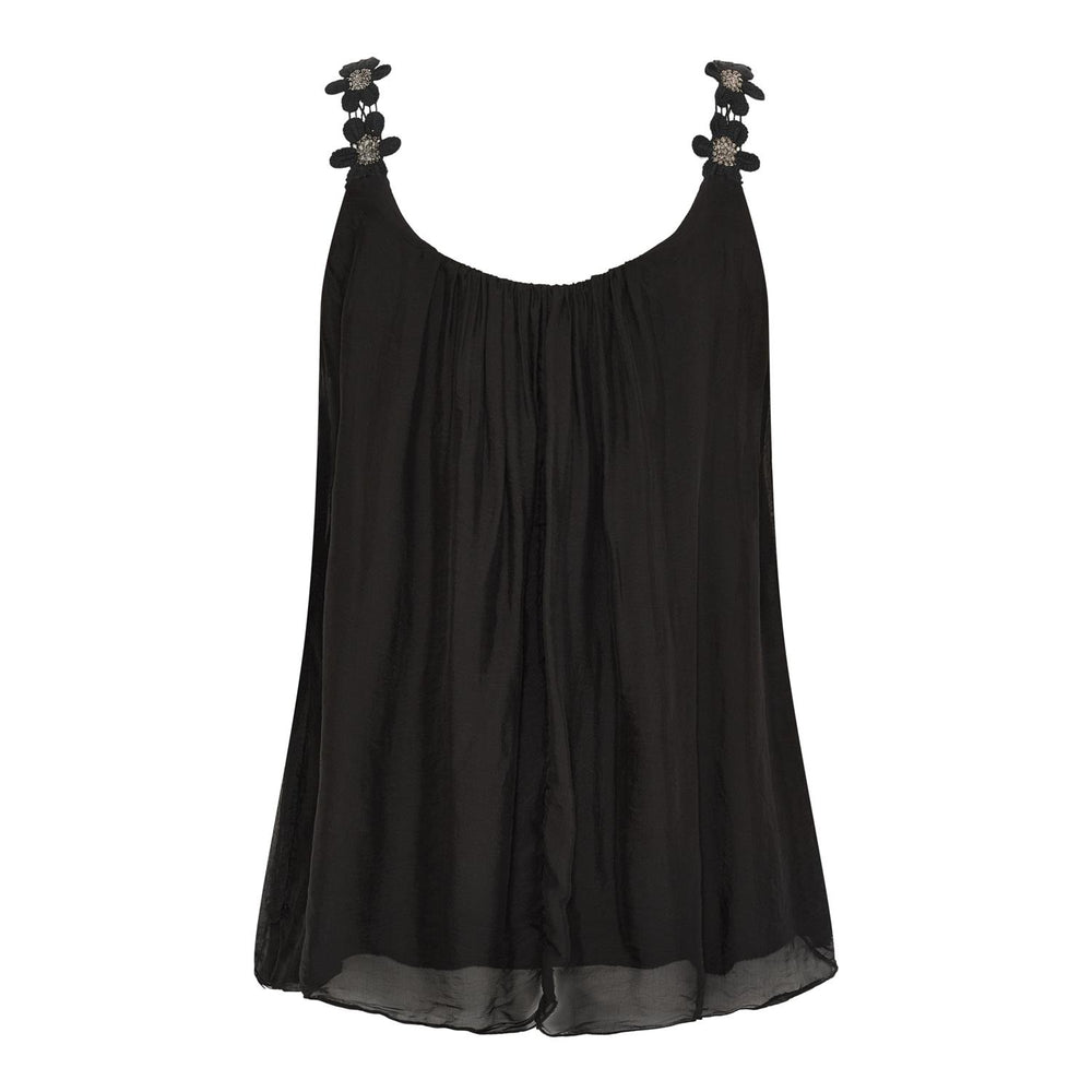 Denne luftige og feminine toppen er et must i sommergarderoben! Med nydelige blomsterstropper og lett, flagrende stoff i 30% silke og 70% viskose, er dette en topp som både ser og føles eksklusiv ut. Den har en løs og ledig passform som faller flatterende over kroppen – perfekt til varme sommerdager eller til fest med en jakke over skuldrene.