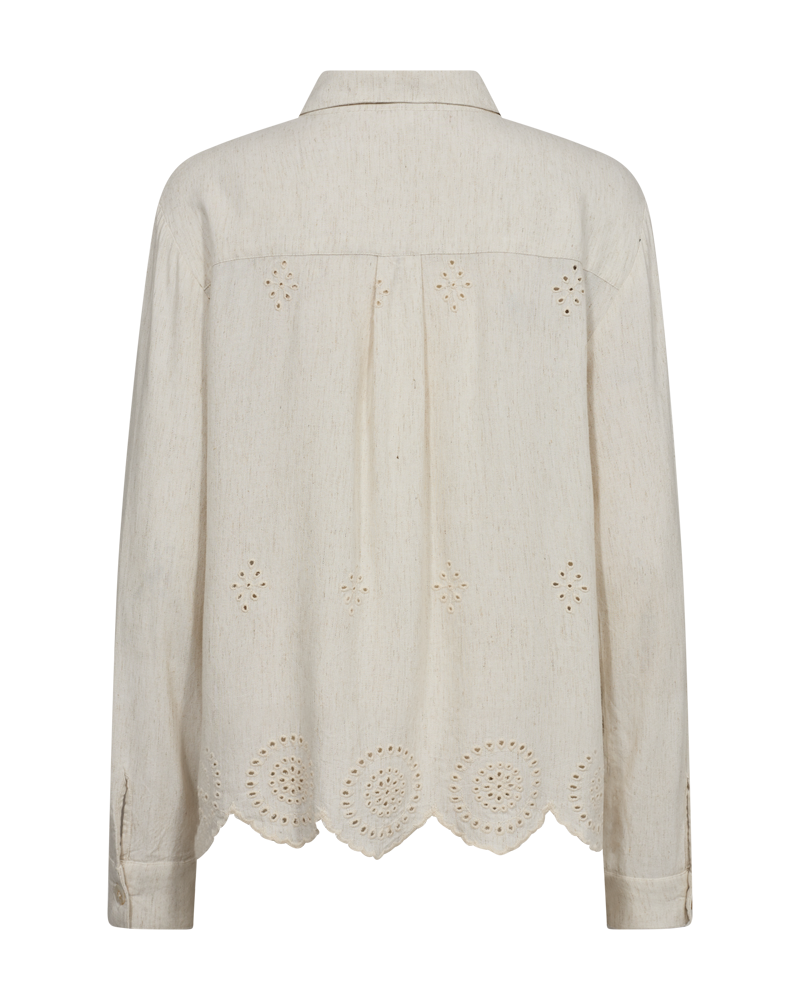 Denne beige skjorten fra Freequent er en nydelig base til vår- og sommergarderoben! Den har et klassisk snitt med delikate broderie anglaise-detaljer som gir skjorten et mykt og feminint uttrykk – akkurat passe pyntet til både hverdag og helg.