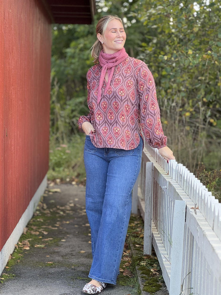 Blusen har en fin v-hals som gir et feminint uttrykk, og de lange ermene med elastikk gjør at den sitter pent uten å stramme. Det er printet som virkelig gjør Luna spesiell – friskt, lekent og helt unikt.