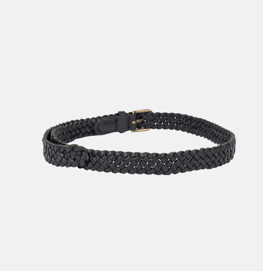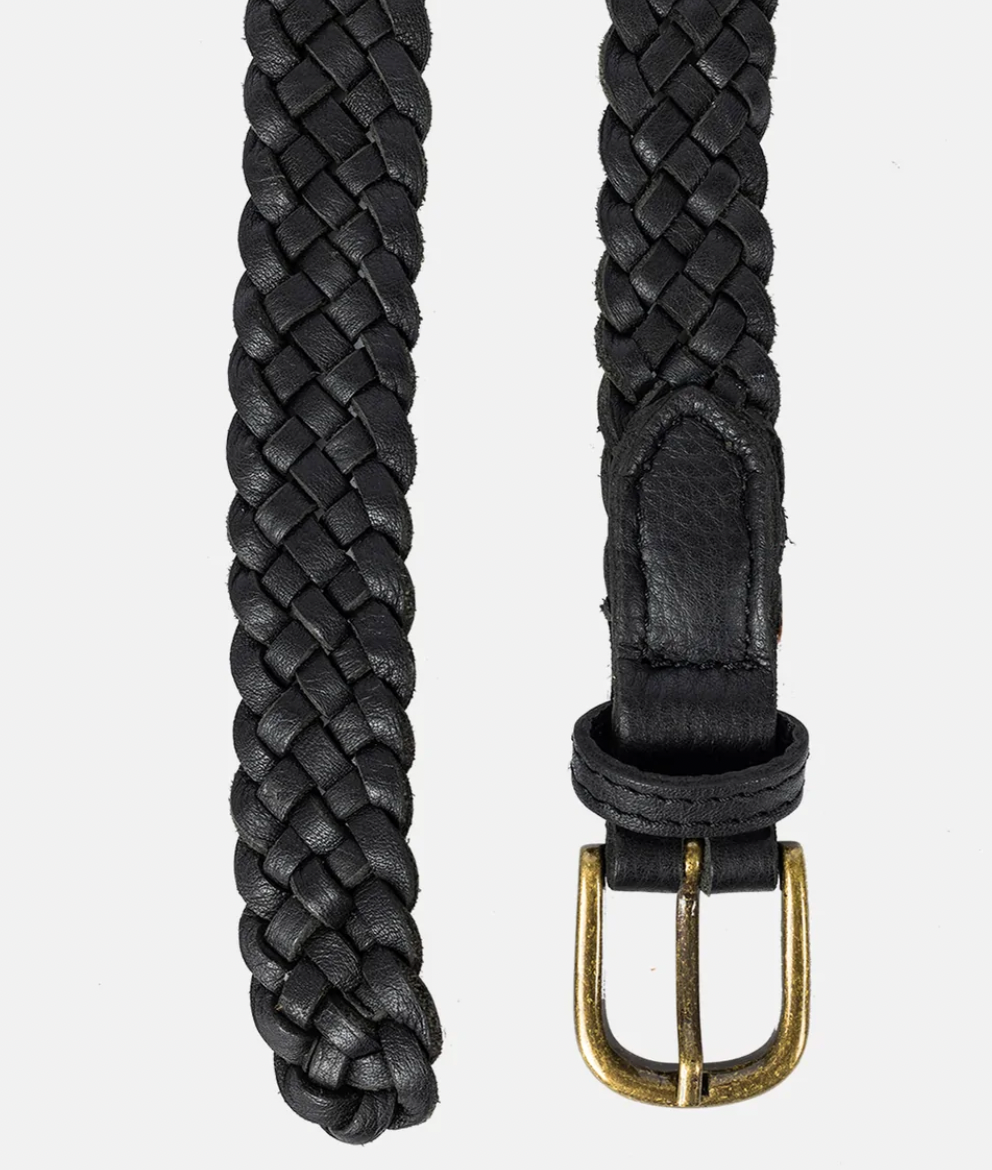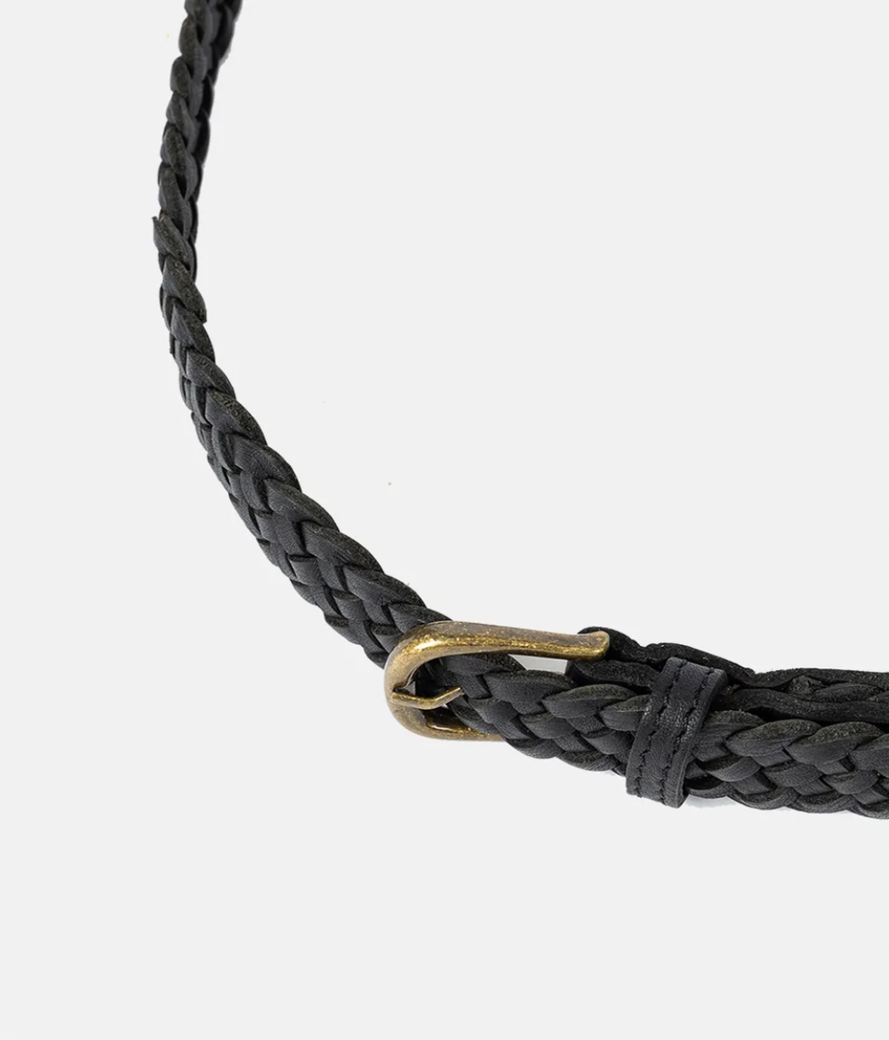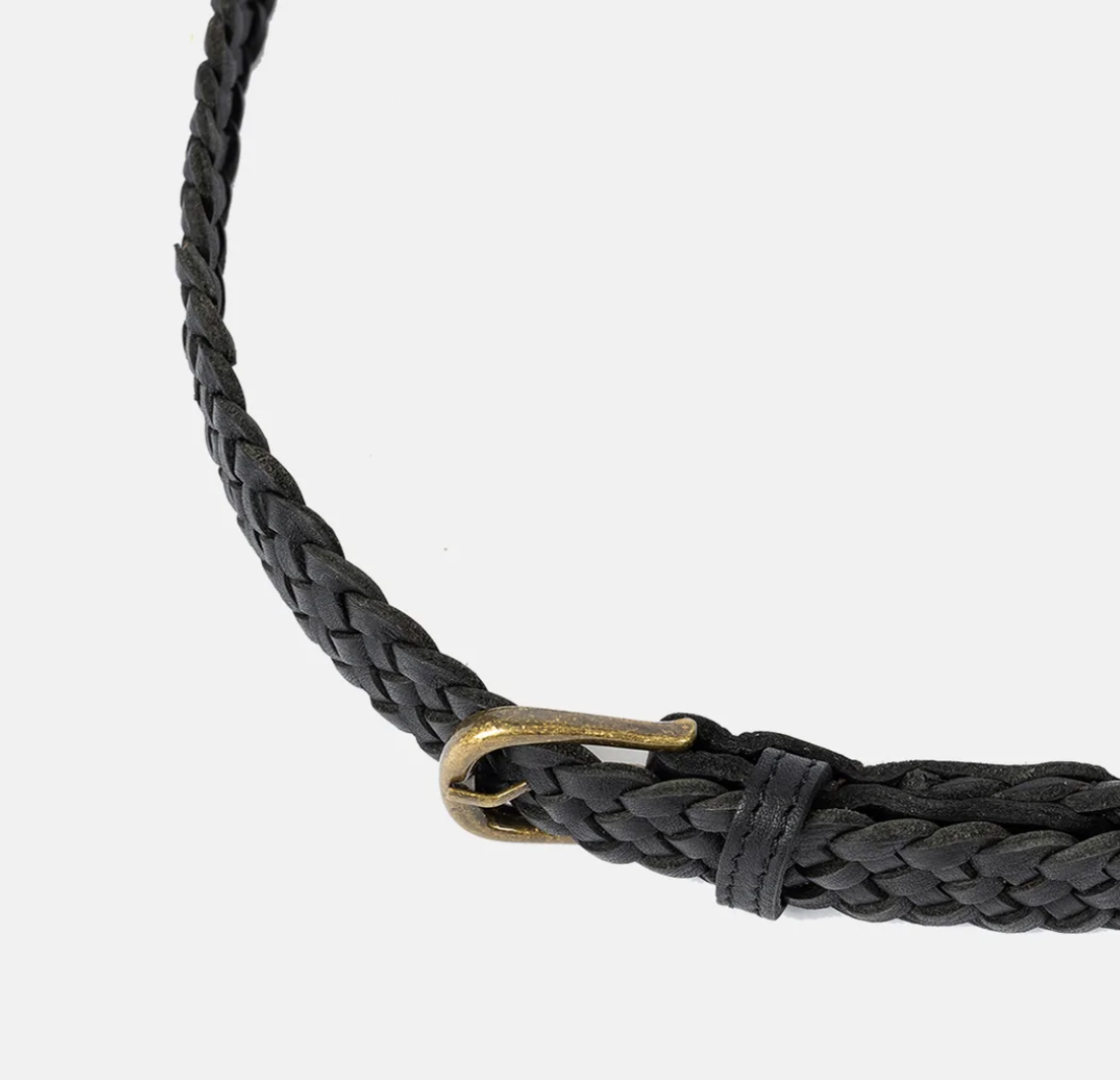 Tynt håndflettet skinnbelte komplettert med en slank messingspenne for et tidløst utseende.