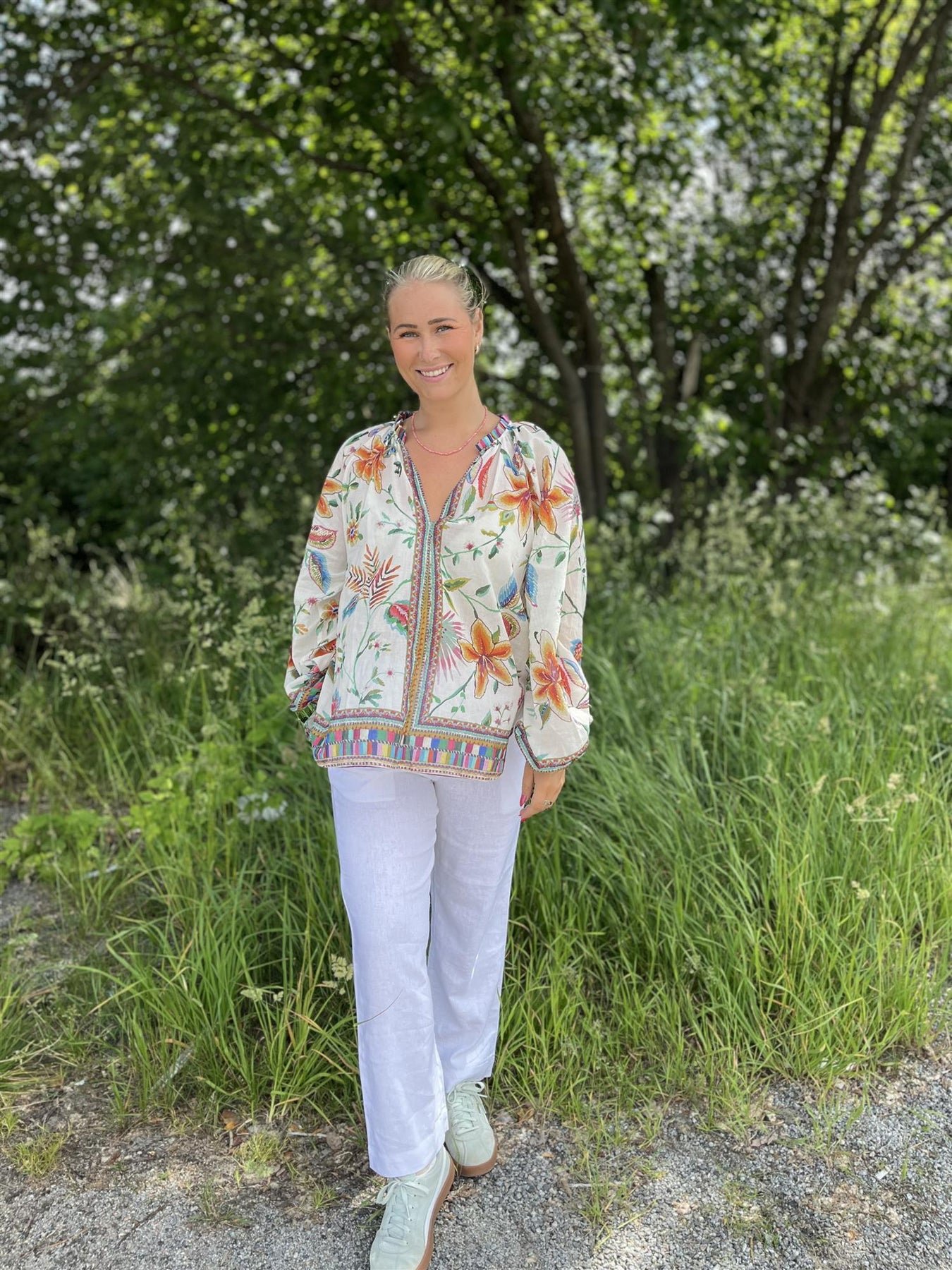 Blusen har en avslappet passform med brede ermer og sĂžte rynkedetaljer ved halsen â akkurat passe bohemsk og feminin. Den faller lett og ledig, og passer like godt til varme sommerdager som til et friskt og fargerikt hverdagsantrekk hele Ă„ret.