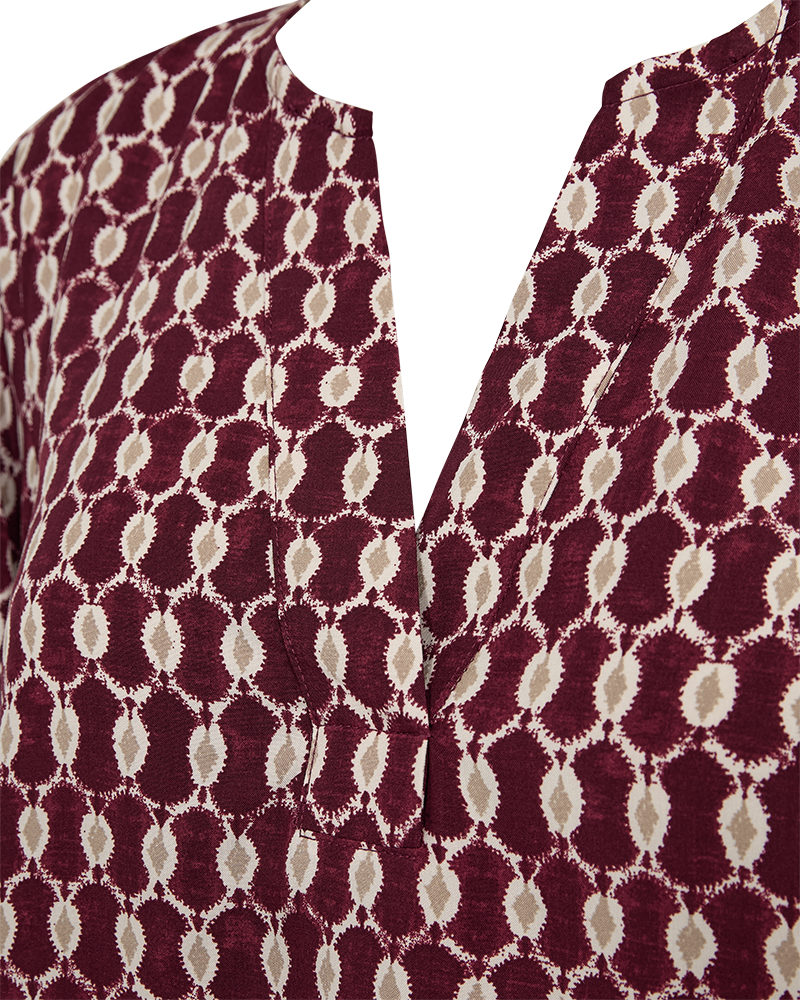 Blusen har en vinrød bunnfarge med diskré mønster i Moonbeam (offwhite) som gir et moderne og stilrent uttrykk. Den har en løs og ledig passform, som gjør den både komfortabel og flatterende – perfekt til deg som liker klær som sitter pent uten å stramme.