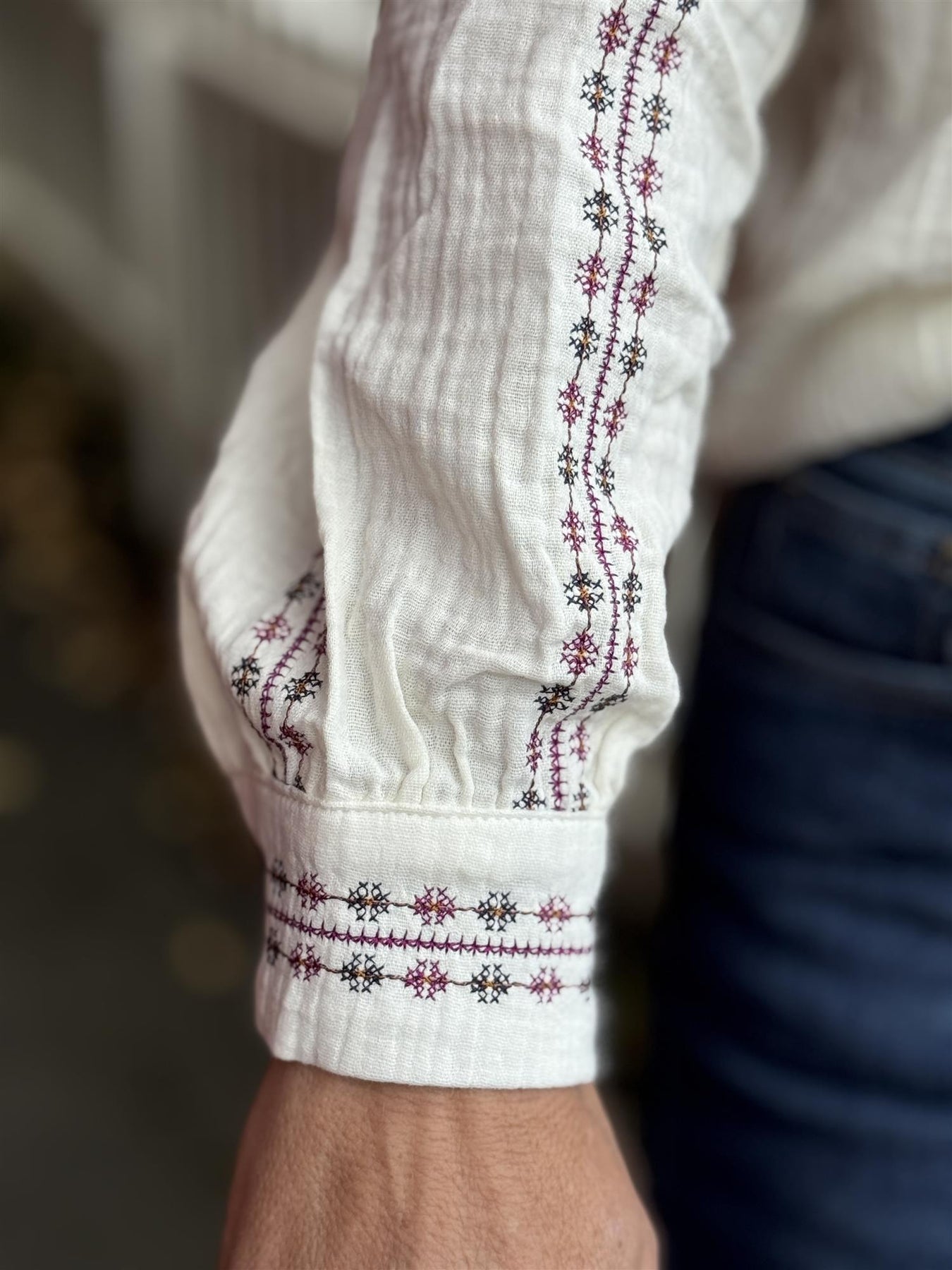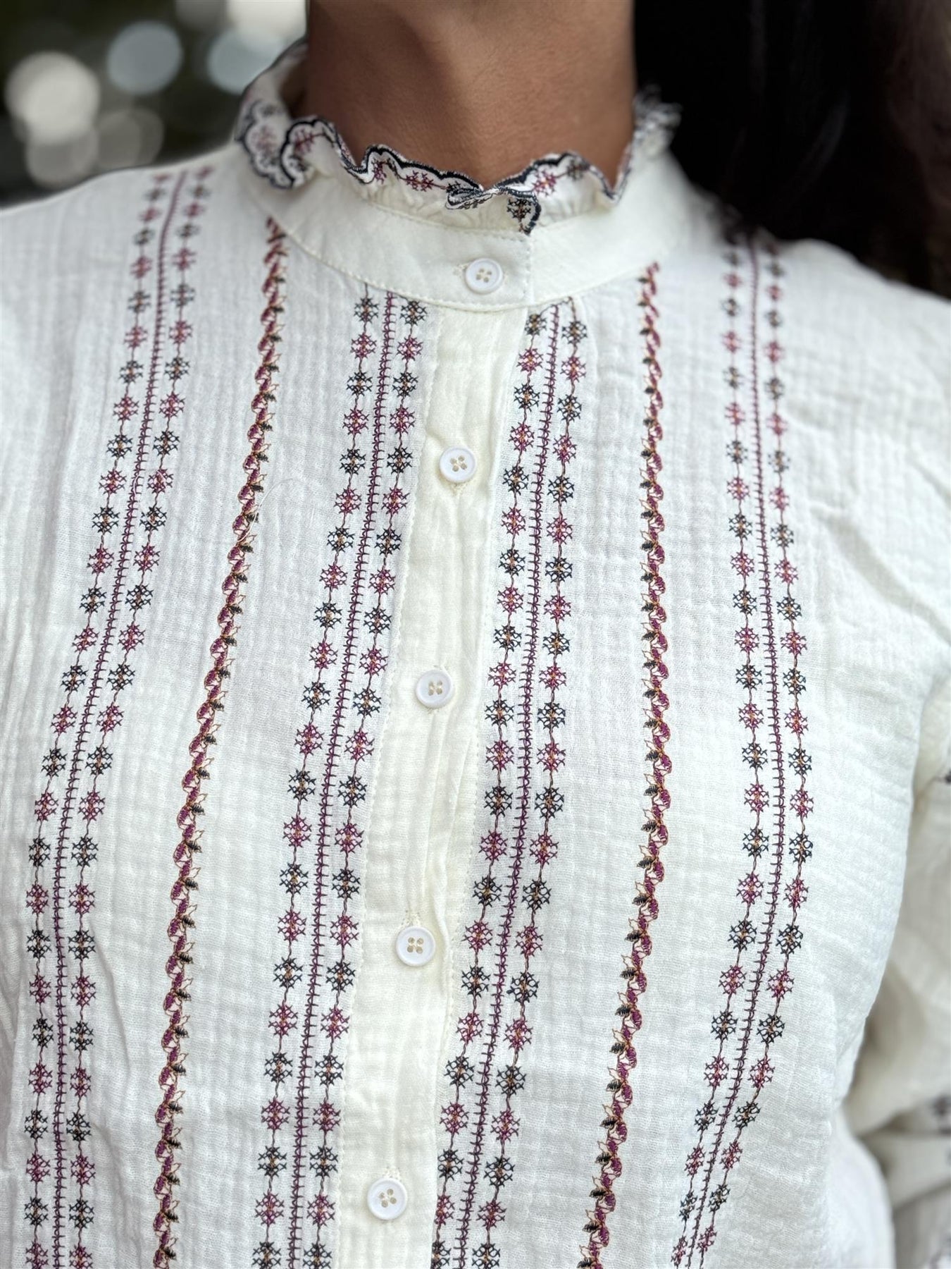 En fin og tidløs bluse i 100 % bomull. Den har delikate broderier foran og på ermene som gir et elegant og unikt uttrykk. Den feminine kragen med lett rysjekant setter prikken over i-en, mens den myke bomullskvaliteten med struktur gjør blusen ekstra behagelig å ha på.