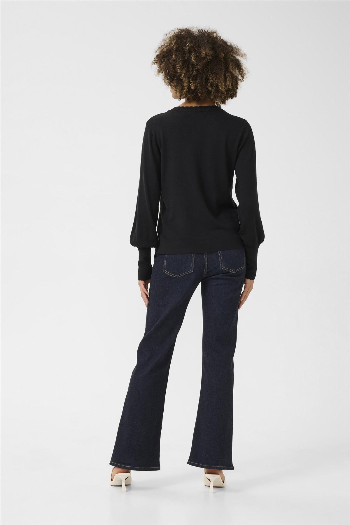 Cardiganen har en klassisk passform med rund hals og lange ermer, men det er de smÄ detaljene som gjÞr den spesiell: dekorative perleknapper foran og en bred mansjett pÄ ermene som skaper en lett og feminin ballongeffekt.