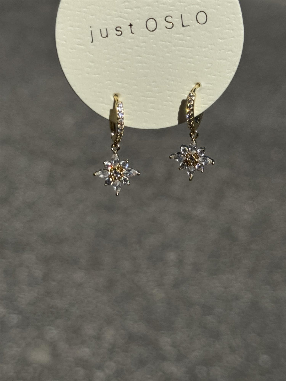 Elegante hoops i gullfarget metall, pyntet med glitrende små stener og et hengende blomsteranheng. Et feminint og luksuriøst design som passer like godt til hverdags som til fest.