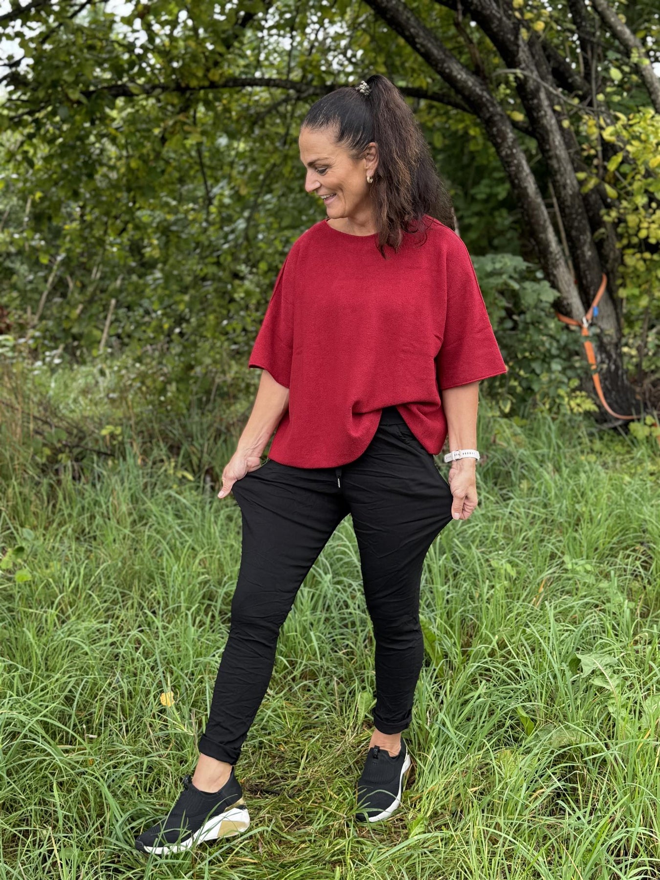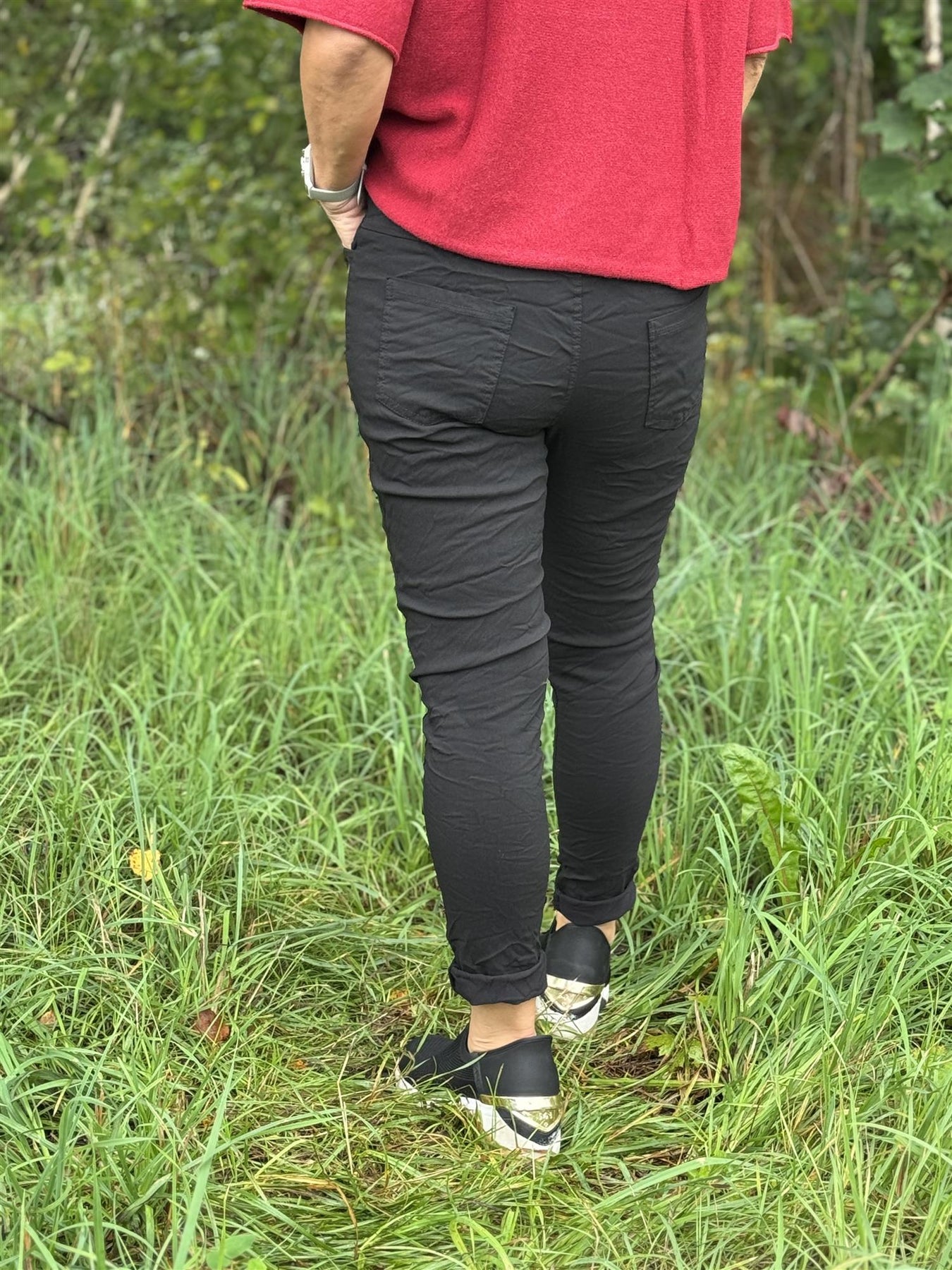 En lett og myk bukse med god stretch som er superbehagelig å bruke hele dagen. Den har strikk og knytting i livet, smal passform. – luftig, komfortabel og flatterende. Med lommer foran og bak.