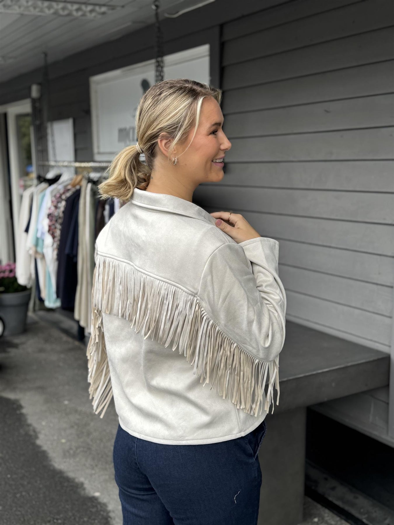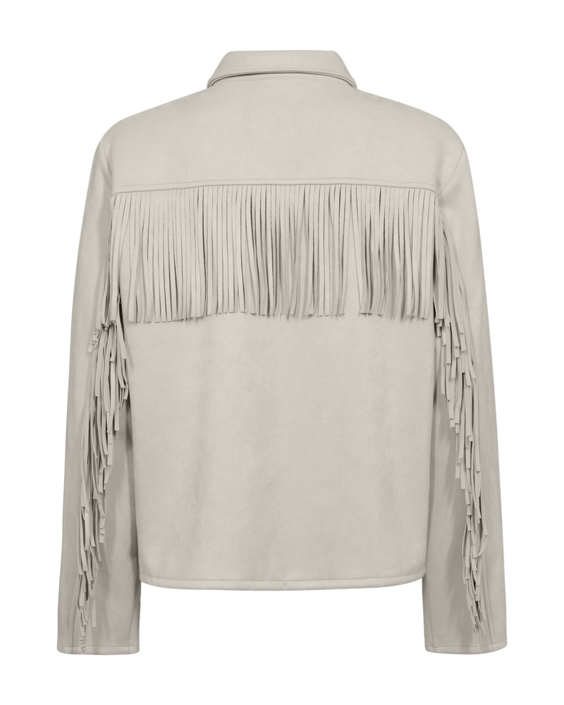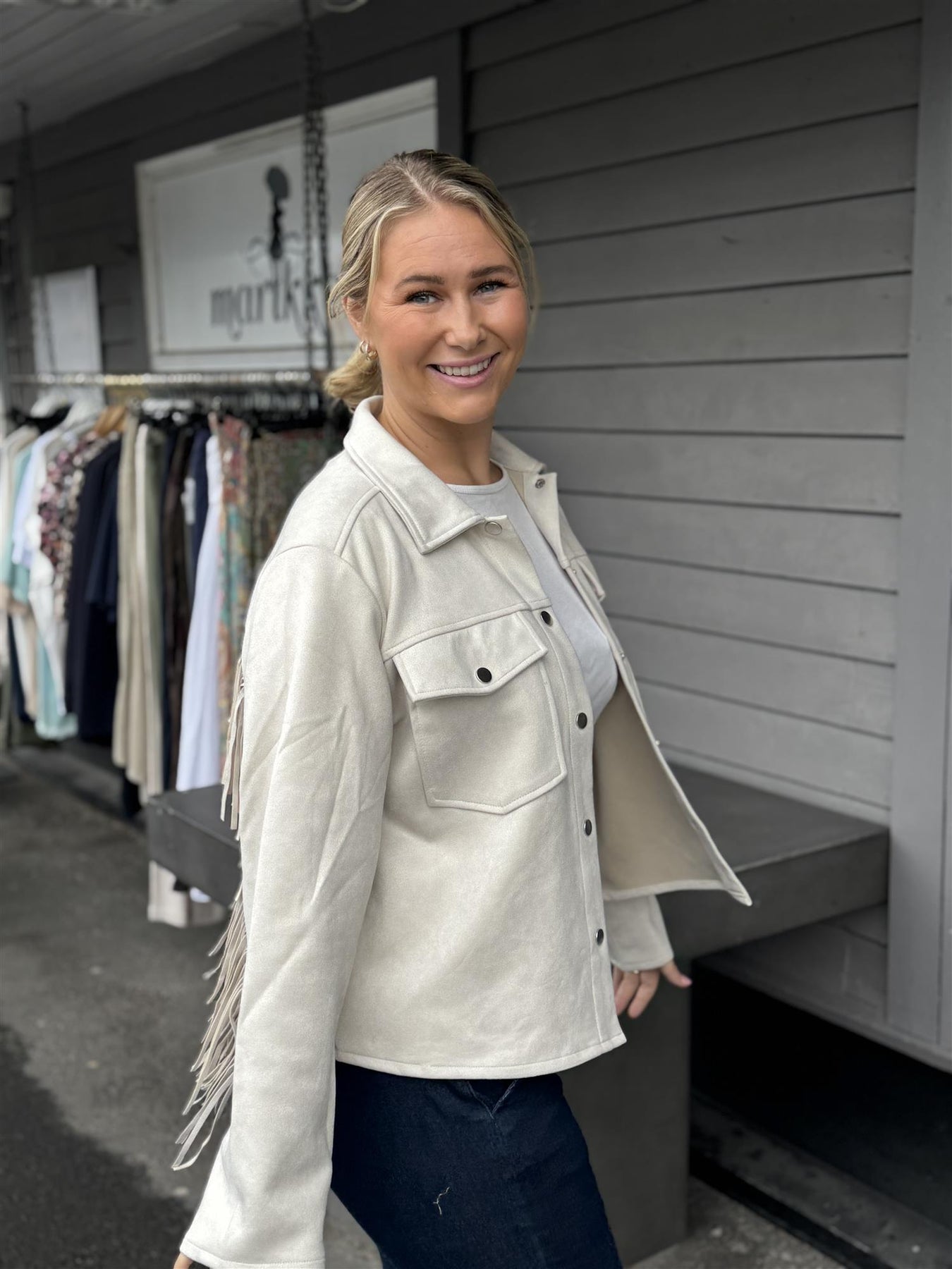 FQDuwa fra Freequent er en råkul skjortejakke med frynser og western-inspirerte detaljer. Jakken er laget i en myk og luksuriøs imitert semsket kvalitet som både ser eksklusiv ut og føles deilig mot huden. Perfekt til å piffe opp ethvert antrekk – enten du skal på bytur, festival eller bare vil føle deg litt ekstra fin i hverdagen.