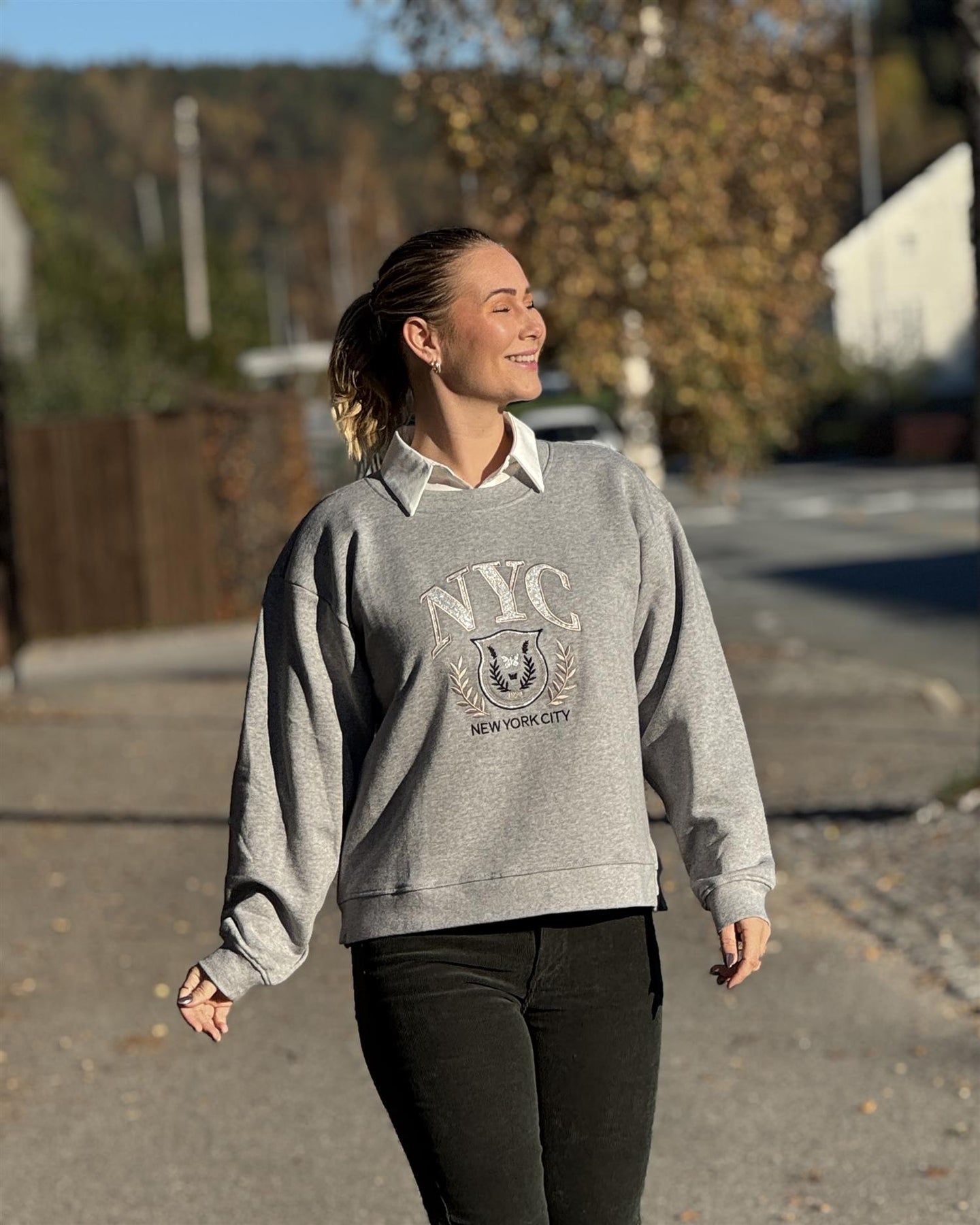 Genseren kommer i en klassisk gråmelert farge med stilig NYC-broderi og emblem foran, som gir den en fresh og urban look. Passformen er avslappet med rund hals og lange ermer – perfekt til både jeans, joggebukser eller over en kjole for en mer laidback vibe.