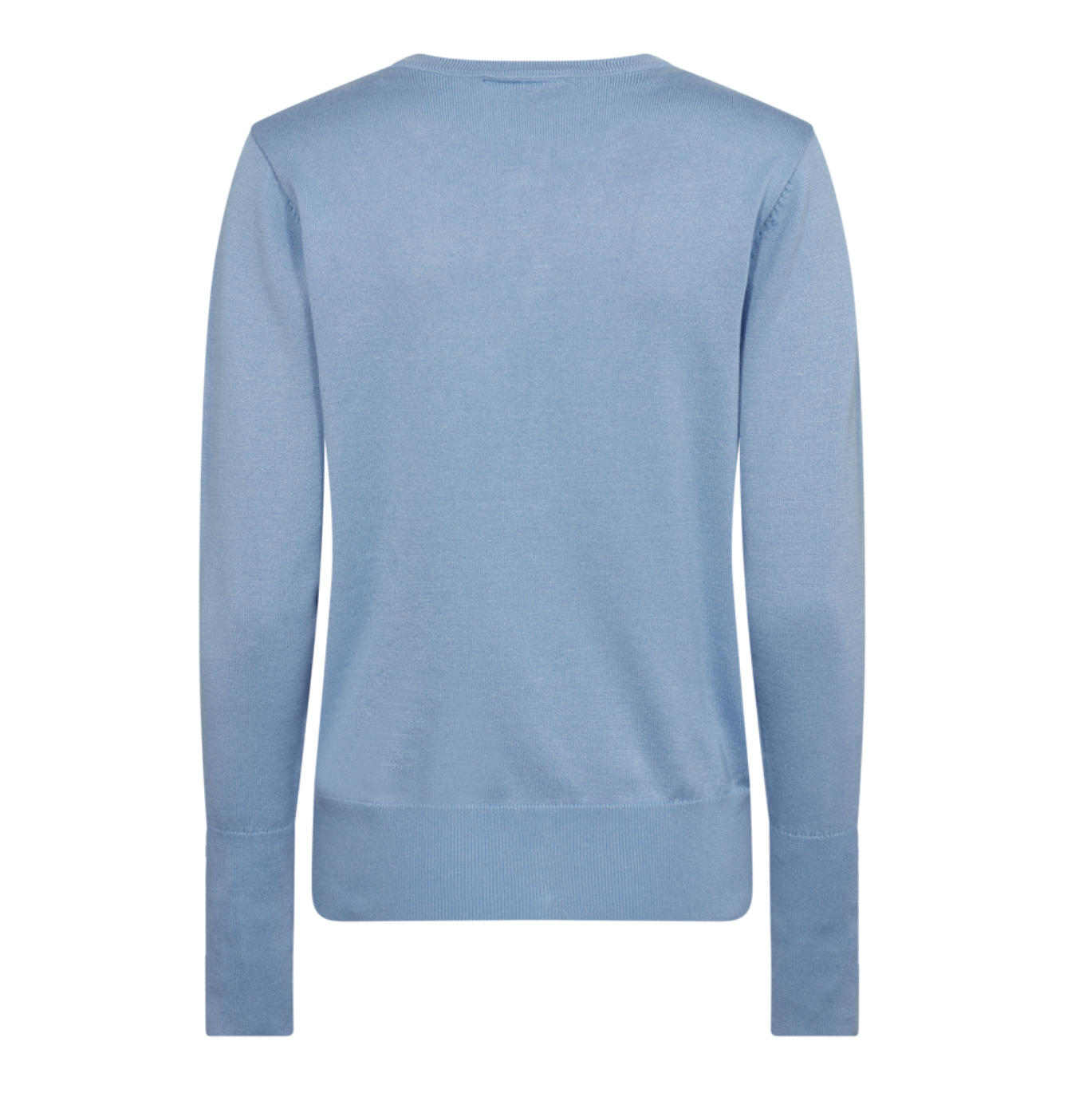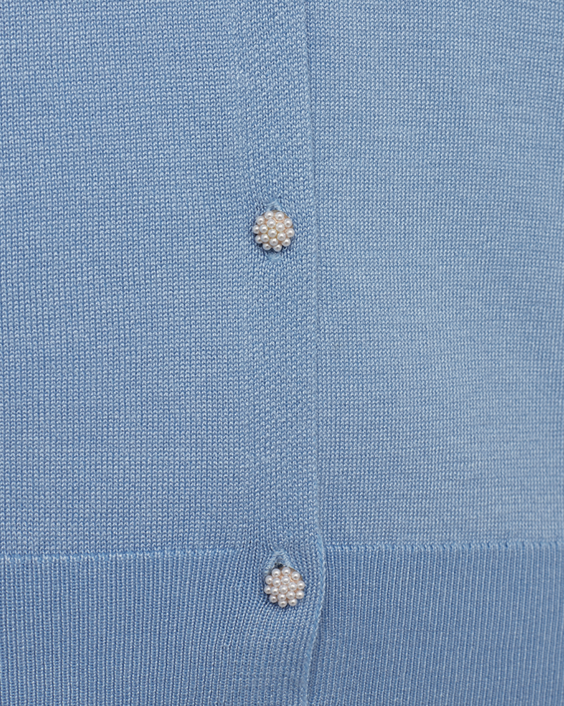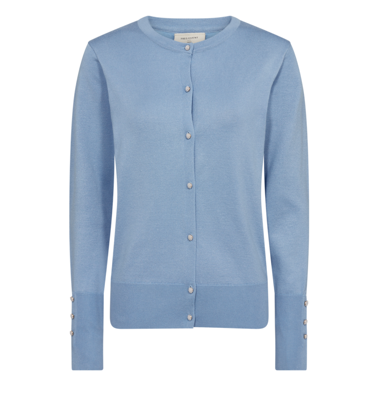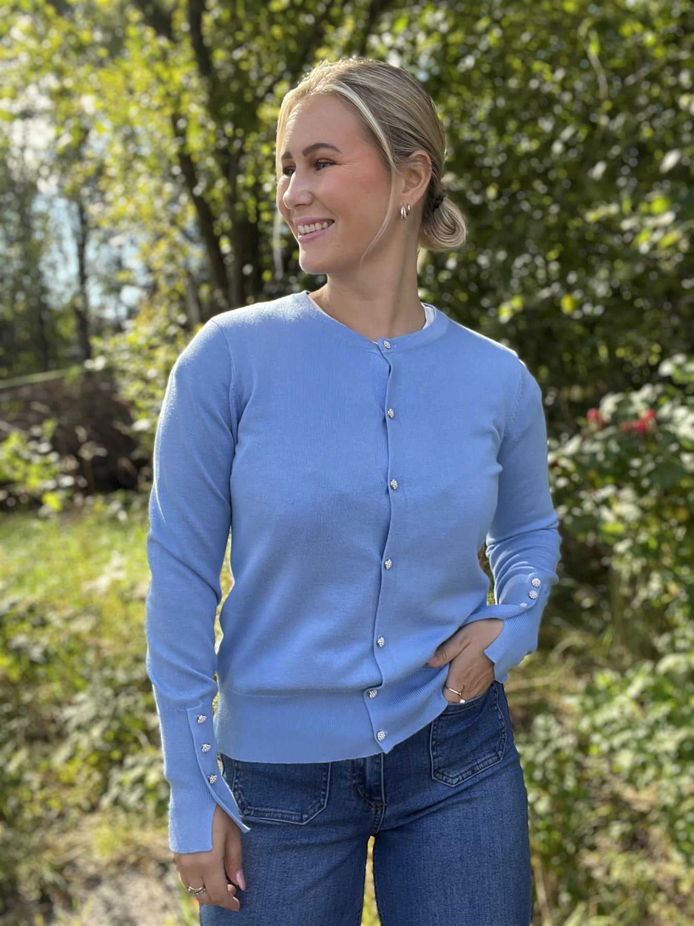 Cardigan i myk, finstrikket kvalitet. Cardiganen er enkel i sin modell med lange ermer, brede ribbekanter og de fineste knappene på ermene og knappelukking foran.