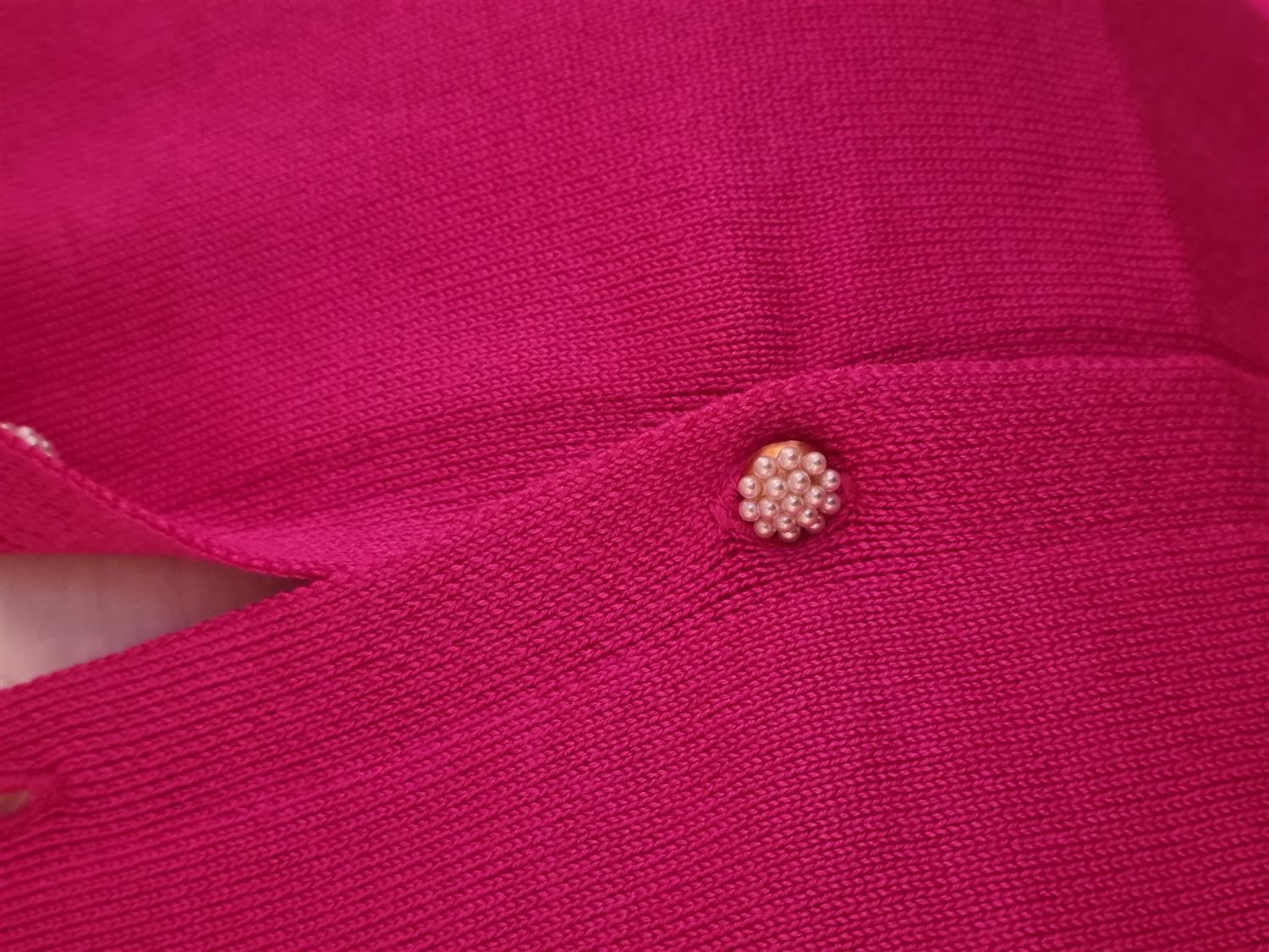 Cardigan i myk, finstrikket kvalitet. Cardiganen er enkel i sin modell med lange ermer, brede ribbekanter og de fineste knappene på ermene og knappelukking foran.