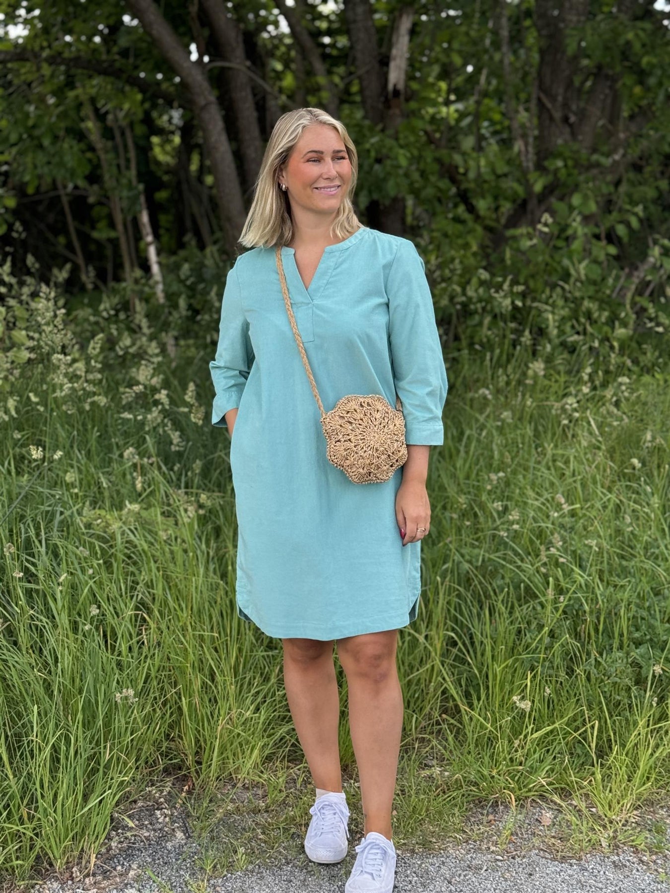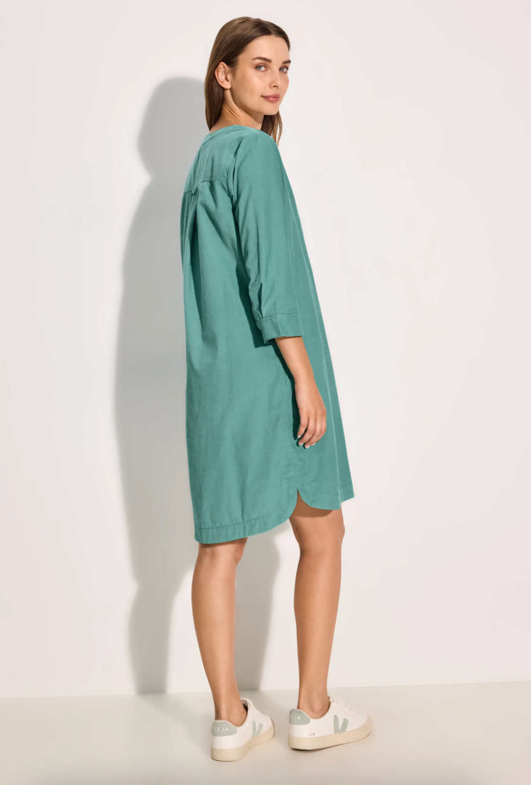 Kordfløyelkjolen fra CECIL. laget av ren bomull, som gjør at den er super behagelig å ha på. Den har rund halse med splitt og 3/4-ermer med mansjetter.