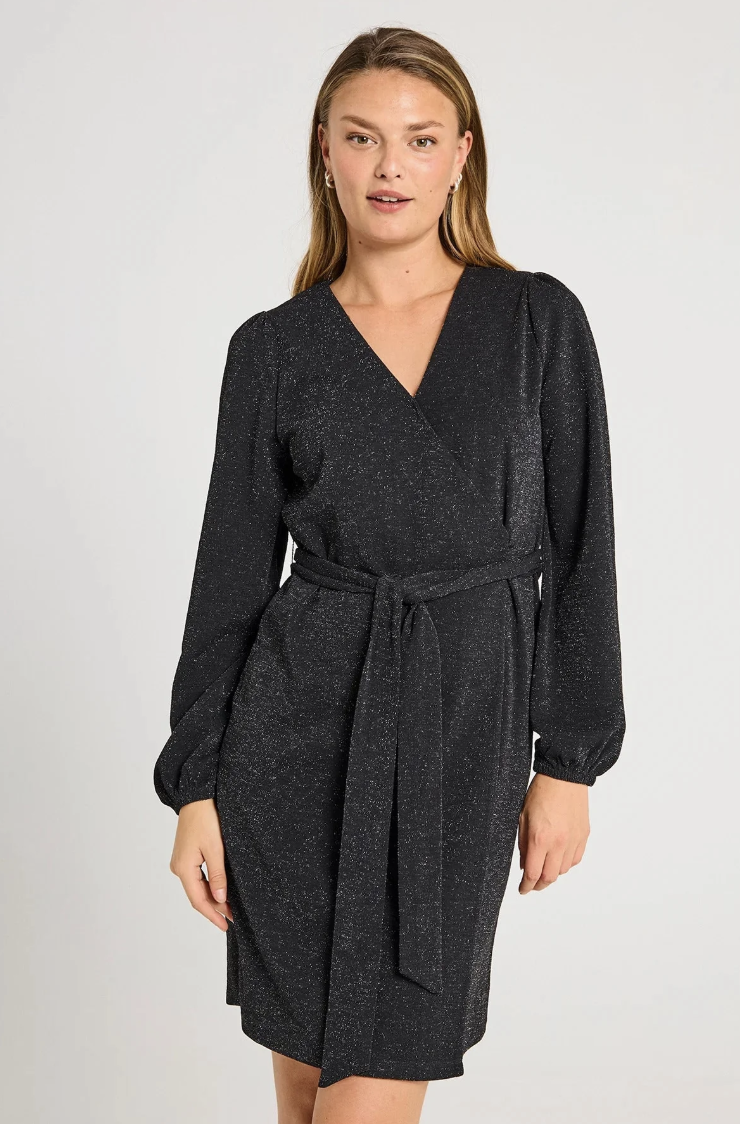 Kjole fra Freequent i et lett materiale med metallisk overflate. Kjolen har en enkel silhuett med lange ballongermer, casual passform, knytebånd i midjen samt V-hals med crossover-detalj.