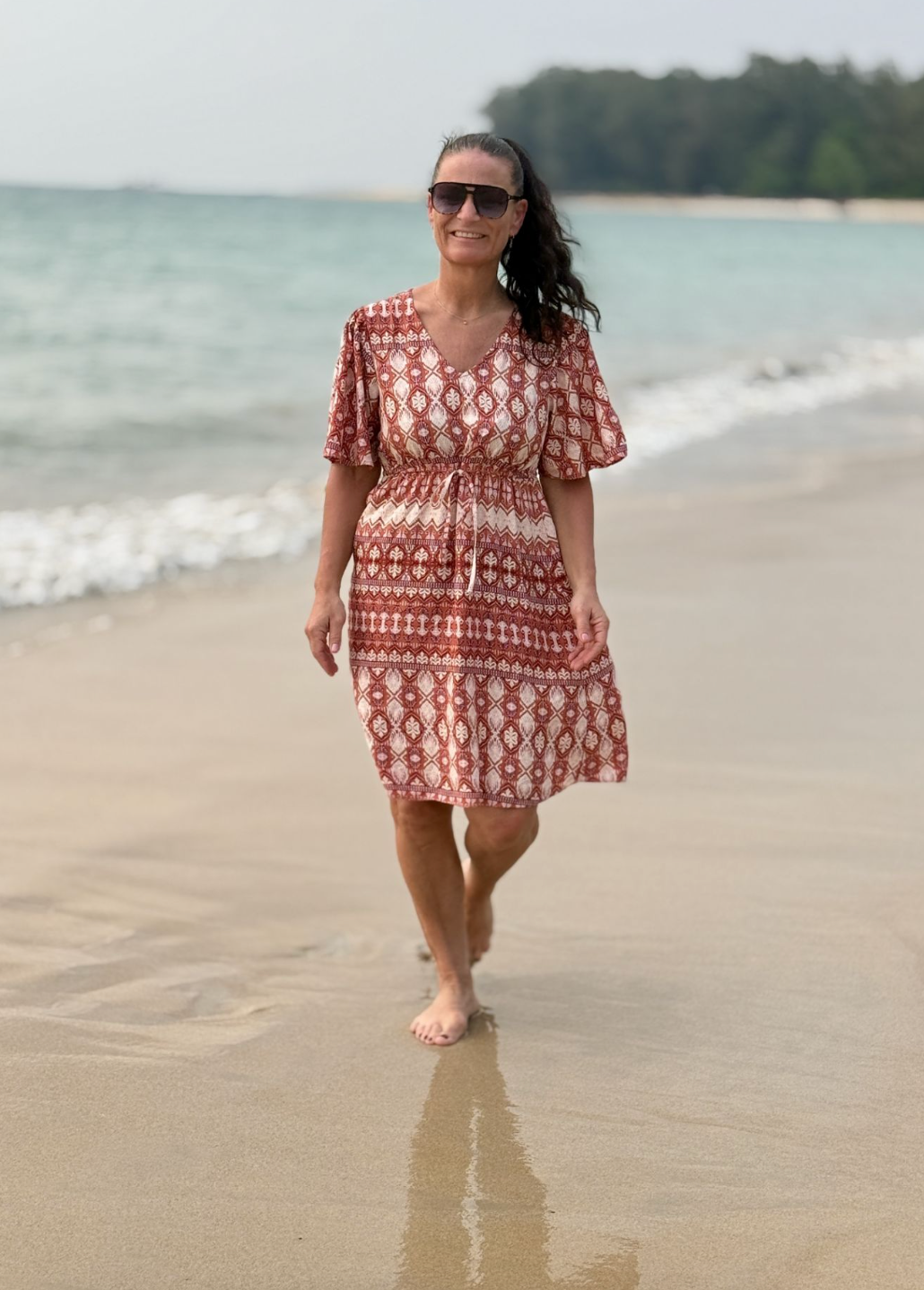 Denne knelange kjolen er laget for Ă„ fĂ„ deg til Ă„ fĂžle deg bĂ„de avslappet og smashing! 😍 Med V-hals, vide ermer og knytebĂ„nd i livet gir den en feminin passform som kler mange fasonger 👗. Det lette viskosestoffet fĂžles svalt og deilig pĂ„ varme sommerdager – perfekt bĂ„de til strandturen đŸ–ïž, sommerfesten đŸč eller til kafĂ©kos med venninner ☕🌾