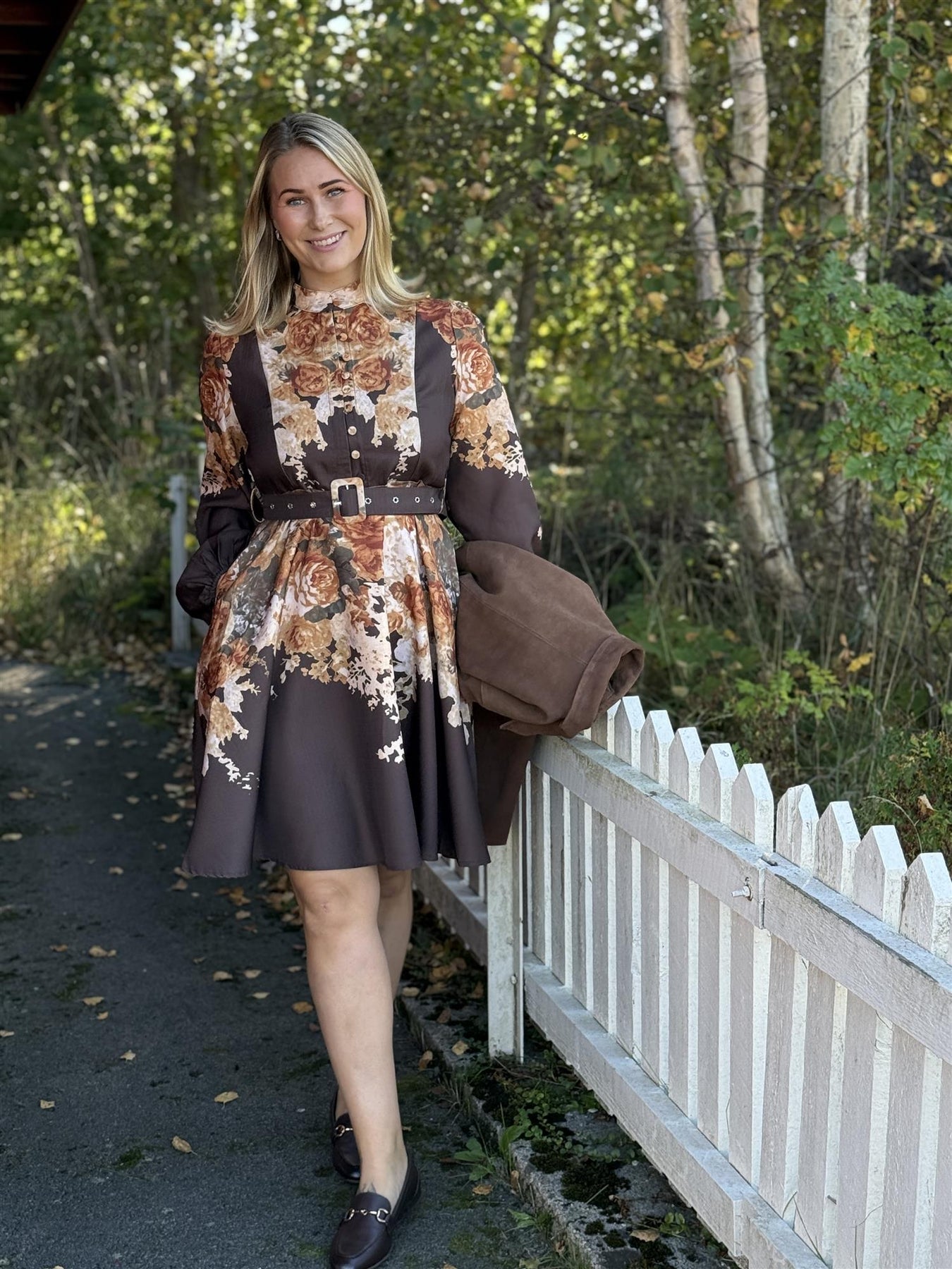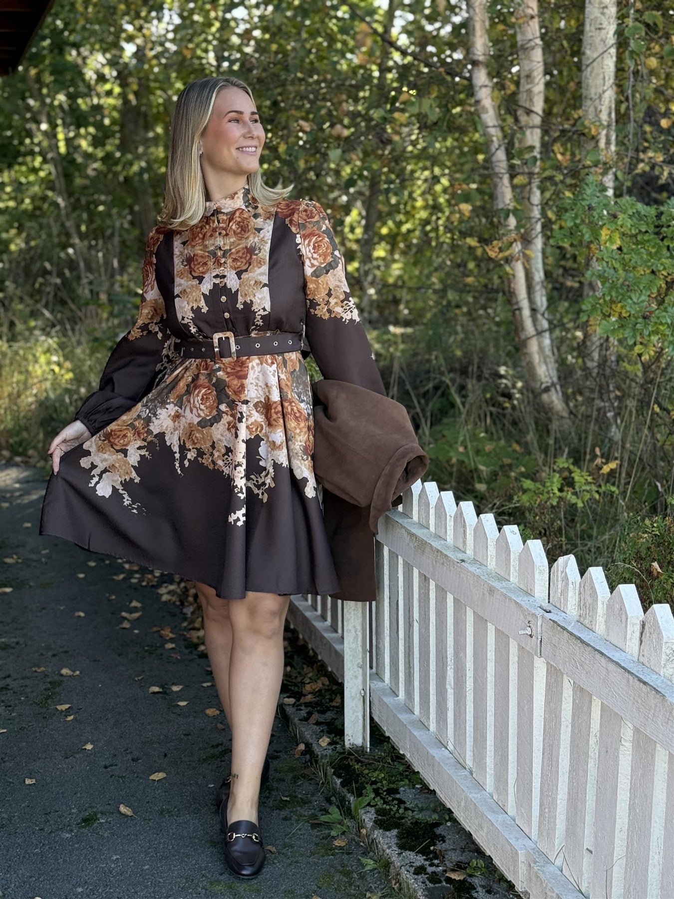 Liva kjolen fra Le Coco er en drøm av en kjole! Med sin varme høstbrune farge og nydelige blomsterprint i cognac og beige toner, får du en kjole som virkelig skiller seg ut.