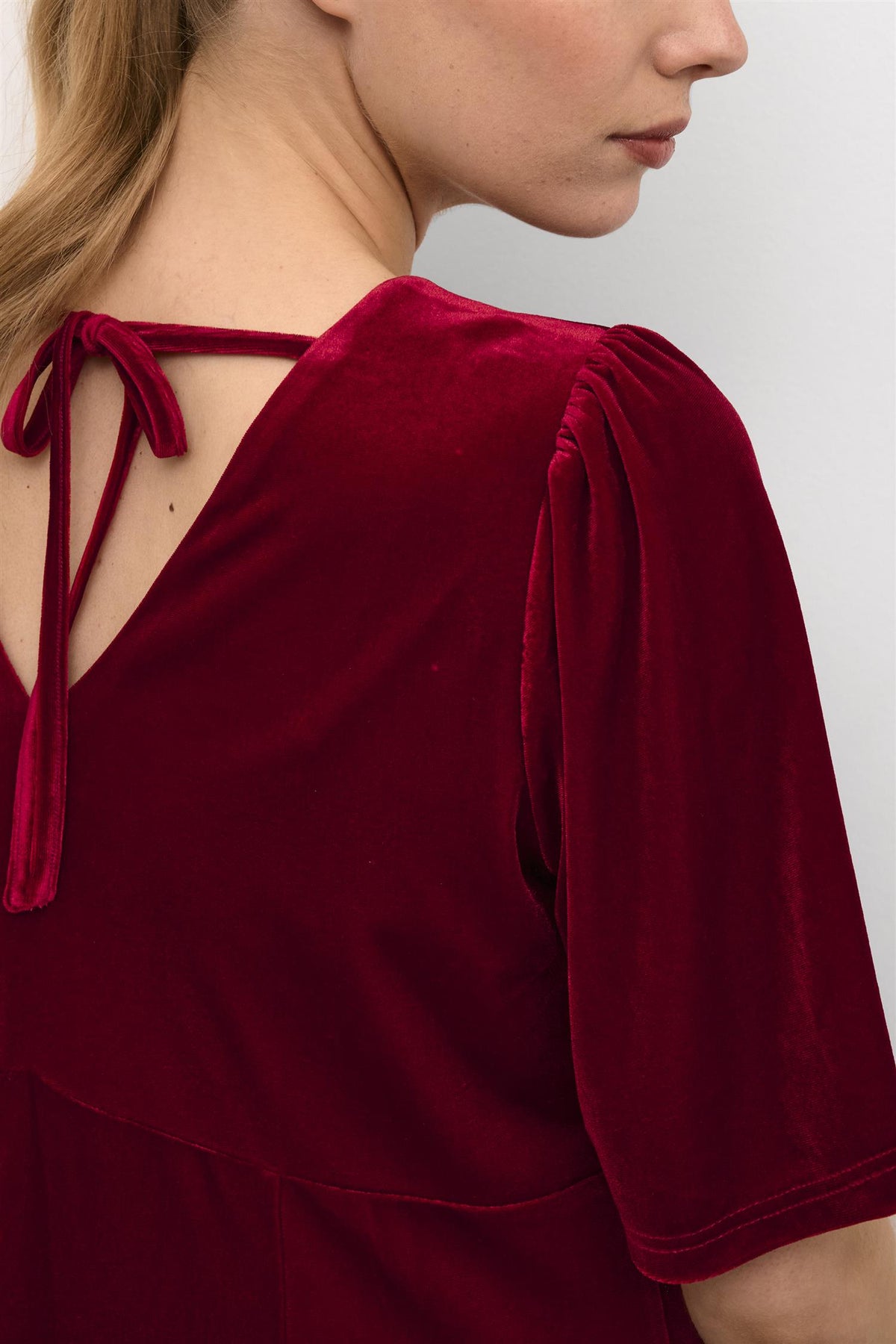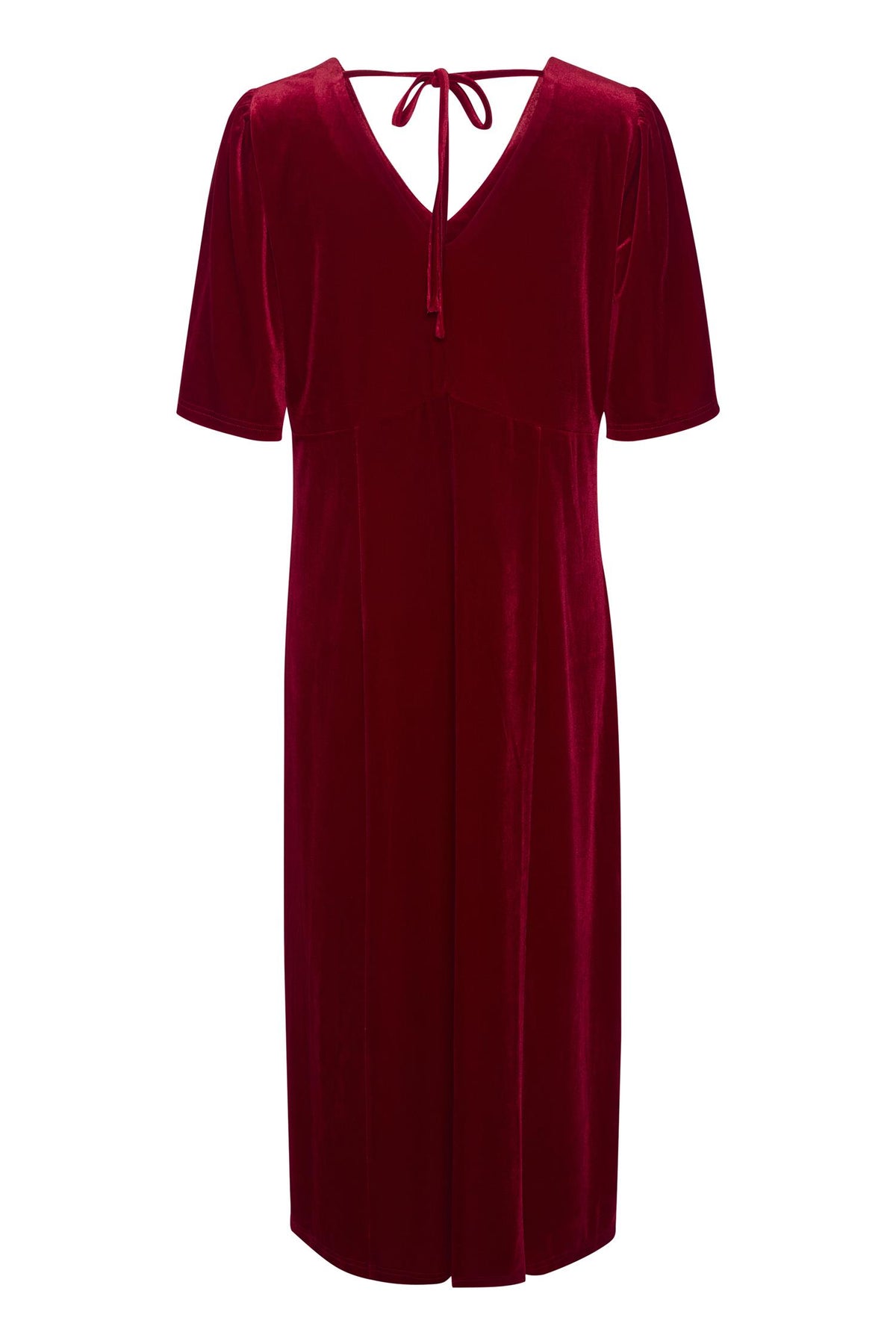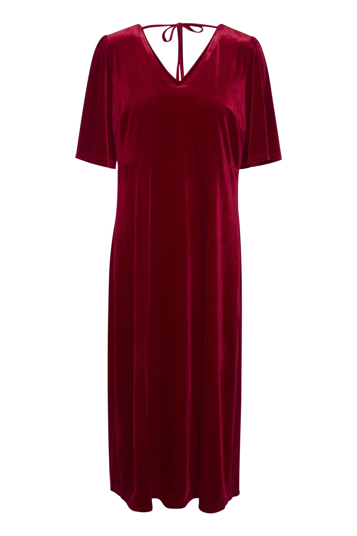 En lekker rød velourkjole fra Cream med knytting i ryggen. Kjolen har v-hals og korte ermer. Legg også merke til den fine splitten foran. Kjolen har stretch i veourstoffet så denne kan du enkelt svinge deg på danskegulvet eller foran grytene om du har invitert til selskap.