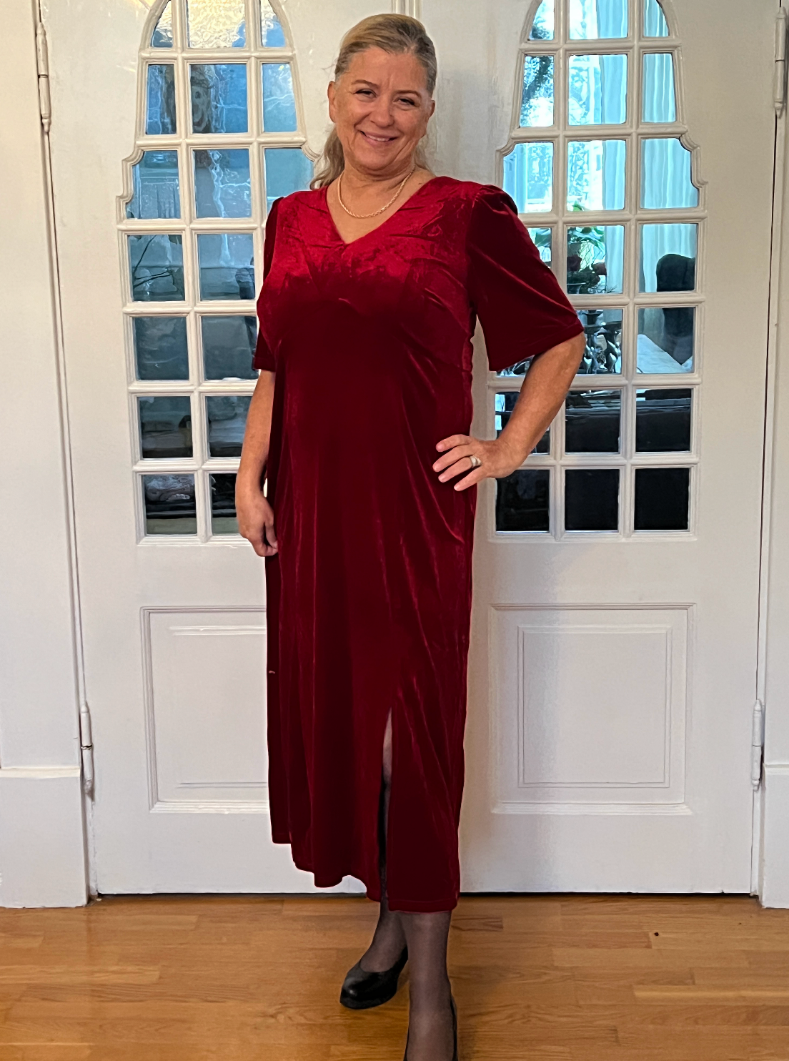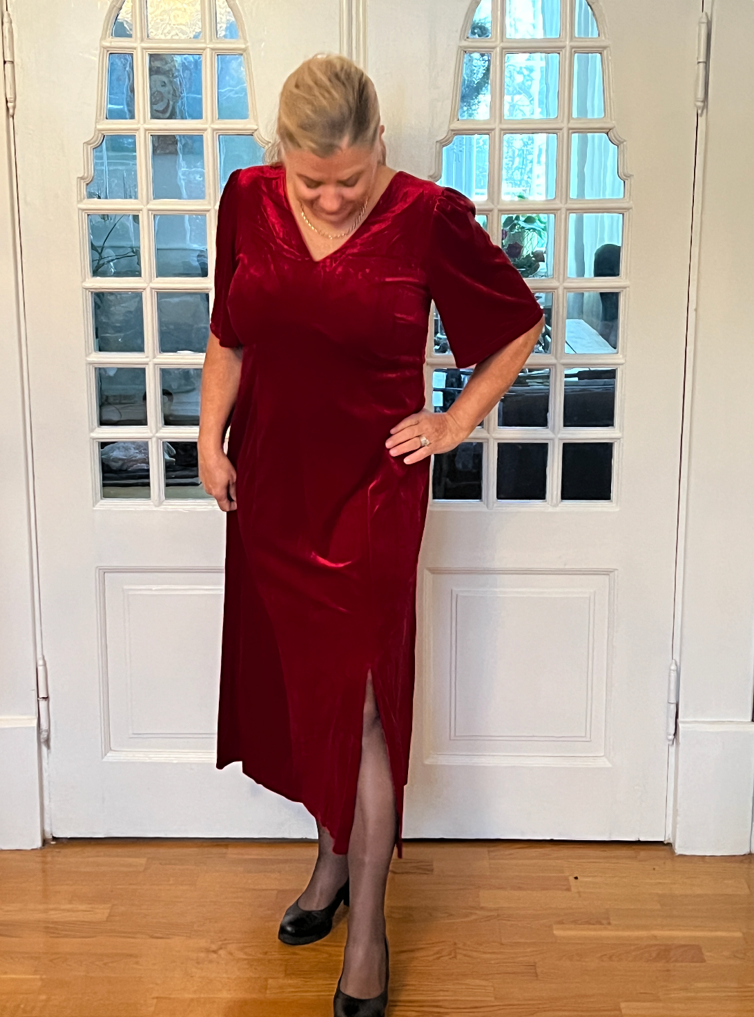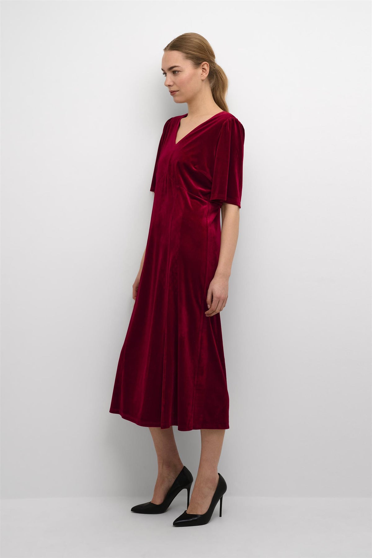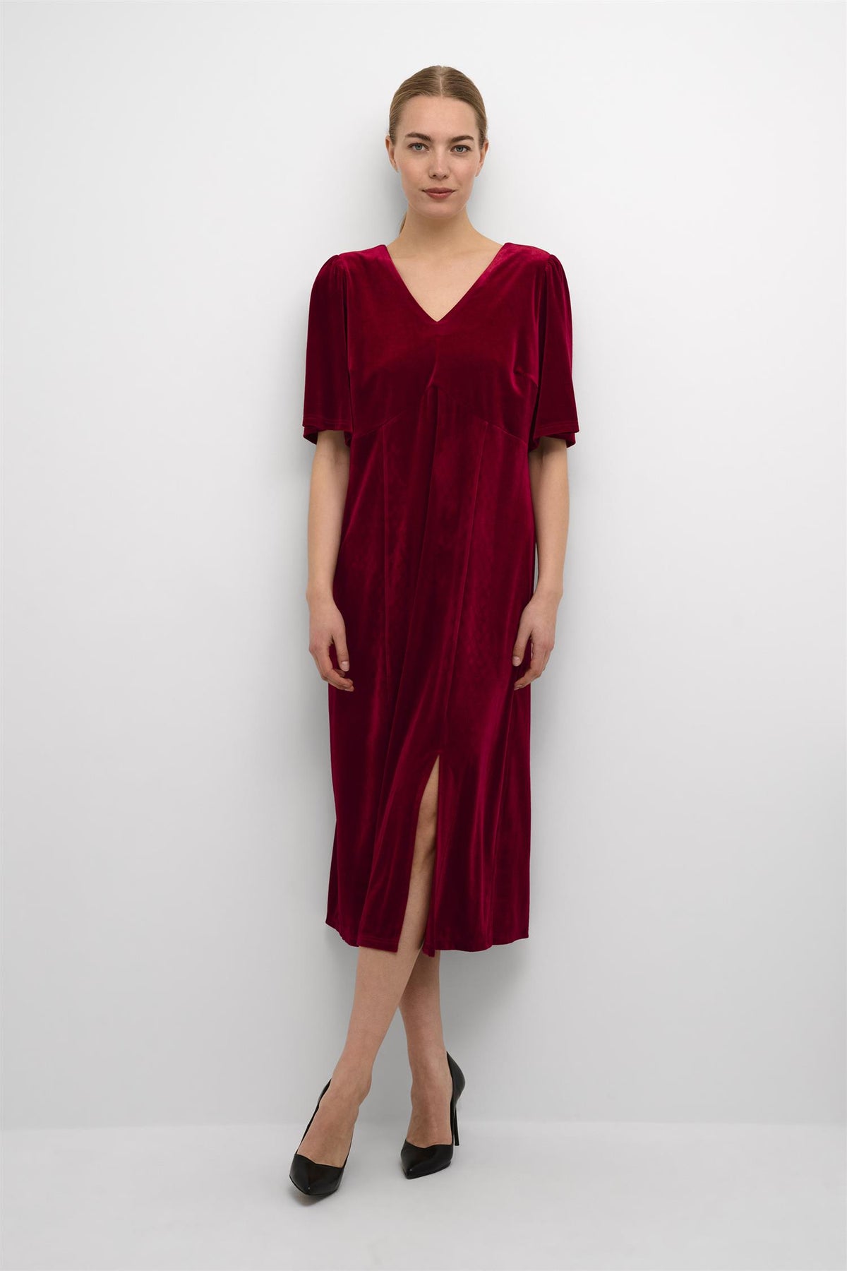 En lekker rød velourkjole fra Cream med knytting i ryggen. Kjolen har v-hals og korte ermer. Legg også merke til den fine splitten foran. Kjolen har stretch i veourstoffet så denne kan du enkelt svinge deg på danskegulvet eller foran grytene om du har invitert til selskap.