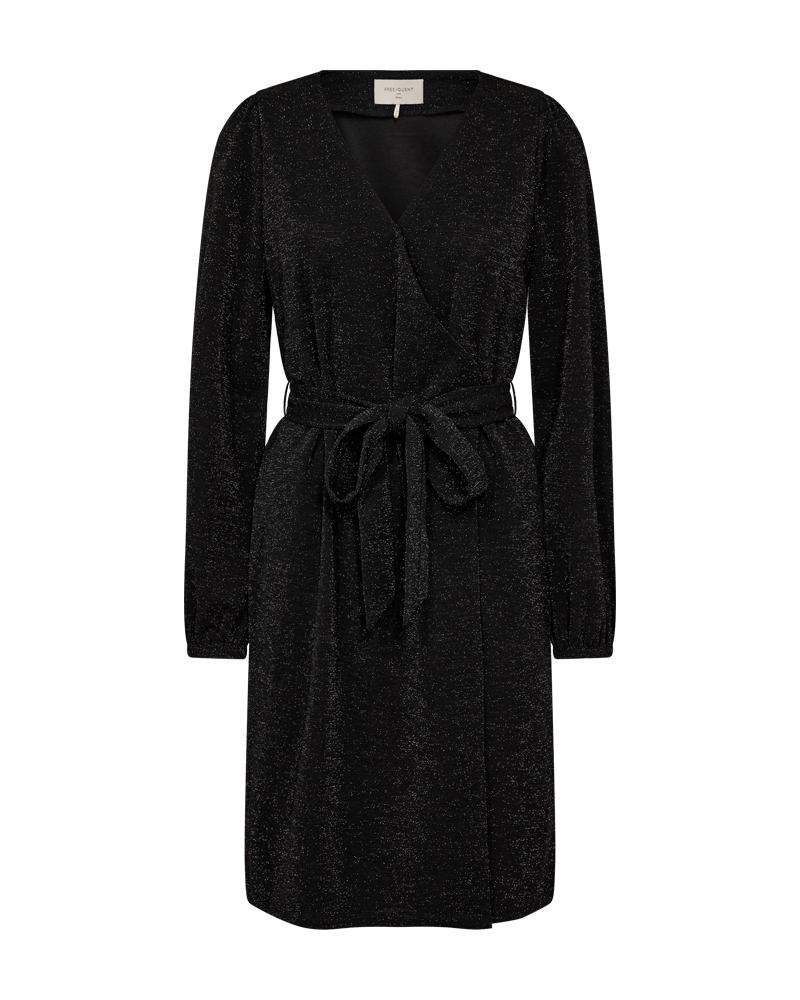 Kjole fra Freequent i et lett materiale med metallisk overflate. Kjolen har en enkel silhuett med lange ballongermer, casual passform, knytebånd i midjen samt V-hals med crossover-detalj.