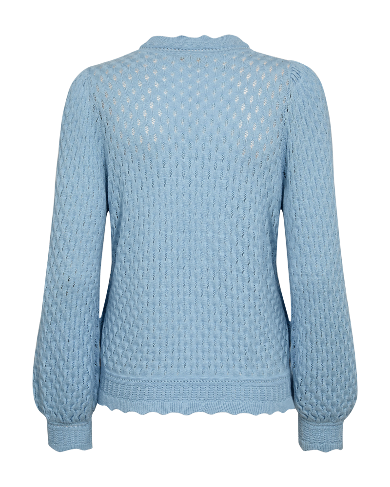 Myk og elegant genser fra Freequent, laget i et finstrikket materiale med et vakkert hullmønster. Genseren har lange puffede ermer, en feminin V-hals og lekre bølgekantede detaljer. Den avslappede passformen og de sofistikerte detaljene gir et feminint og stilig uttrykk.