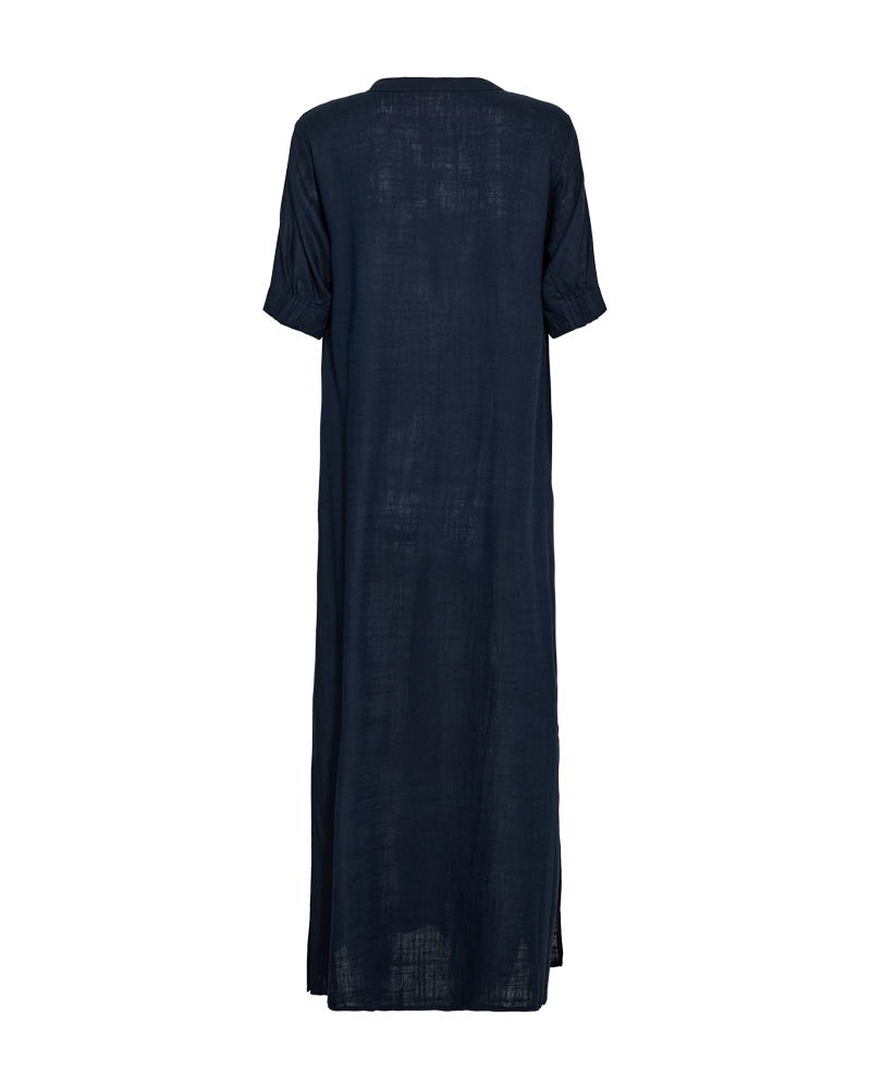 Kjolen har en løs og ledig passform med flatterende legg foran som gir en fin bevegelse i skjørtet. V-utringningen og knappene gir et ekstra løft til uttrykket, og den har korte ermer med strikk i ryggen for ekstra komfort. Perfekt for varme dager – enten du skal tusle rundt i byen, på jobb eller nyte en lunsj i sola.