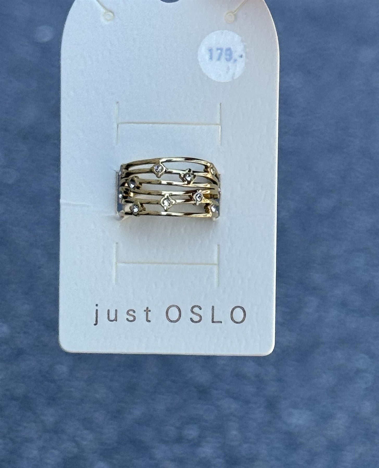 Ring med seks rader i gullfarget stål, dekorert med små, glitrende krystaller.