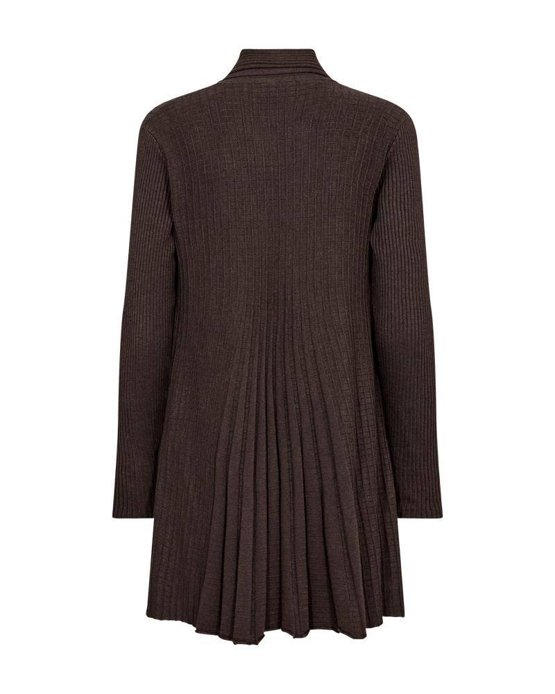 Myk, halvlang cardigan fra Freequent i en elegant coffee brown farge. Den har en enkel, åpen fasong med lange ermer og ribbede detaljer. Både foran og bak finner du fine legg som gir plagget et flatterende fall og en feminin A-shape.