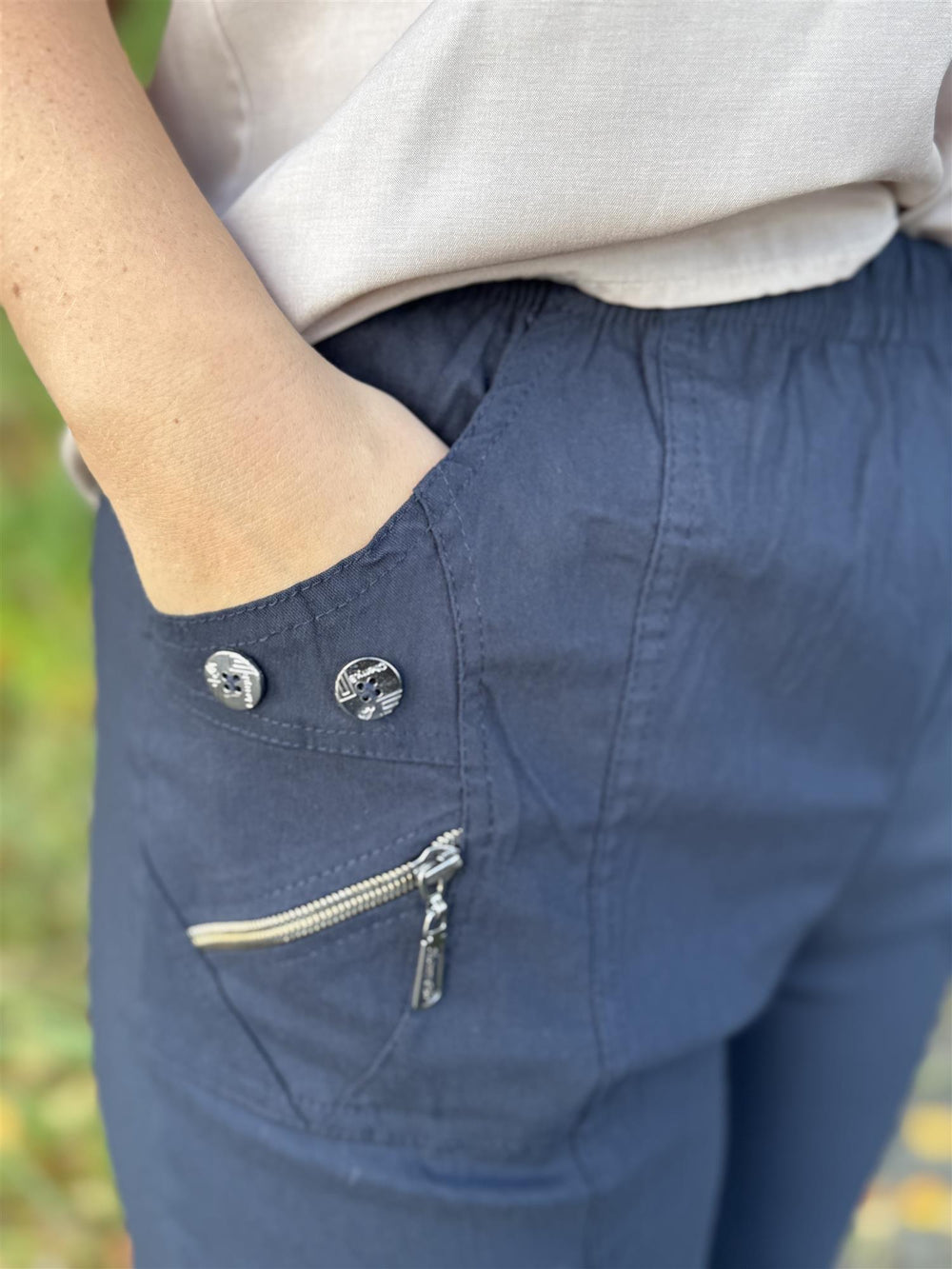 De tøffe glidelås- og knappedetaljene gir buksen et moderne og stilfullt uttrykk, enten du styler den til jobb, cafétur eller en kveld ute.