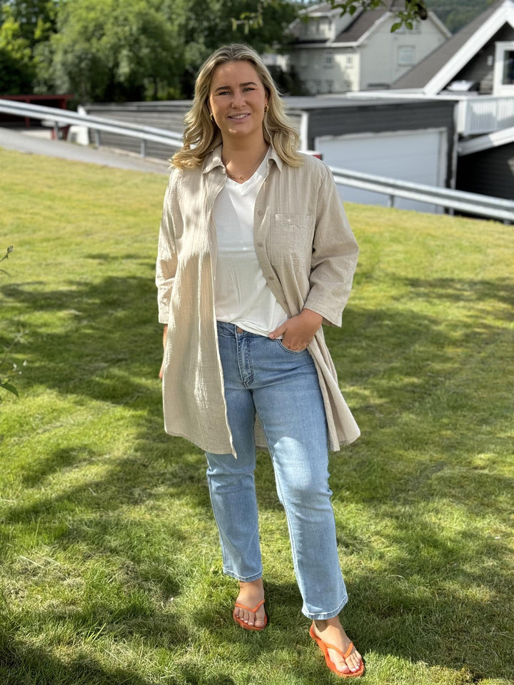 Bomulls skjorte fra kaffe som kan brukes som en kjole eller en skjorte.