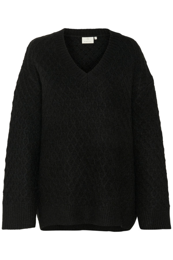 Strikket oversized genser med v-hals. Genseren lenger bak enn foran. Fin struktur i stoffet, ribbekant rundt ermen og i bunnen. Stor i størrelsen så her kan du gå ned 1-2 størrelser.