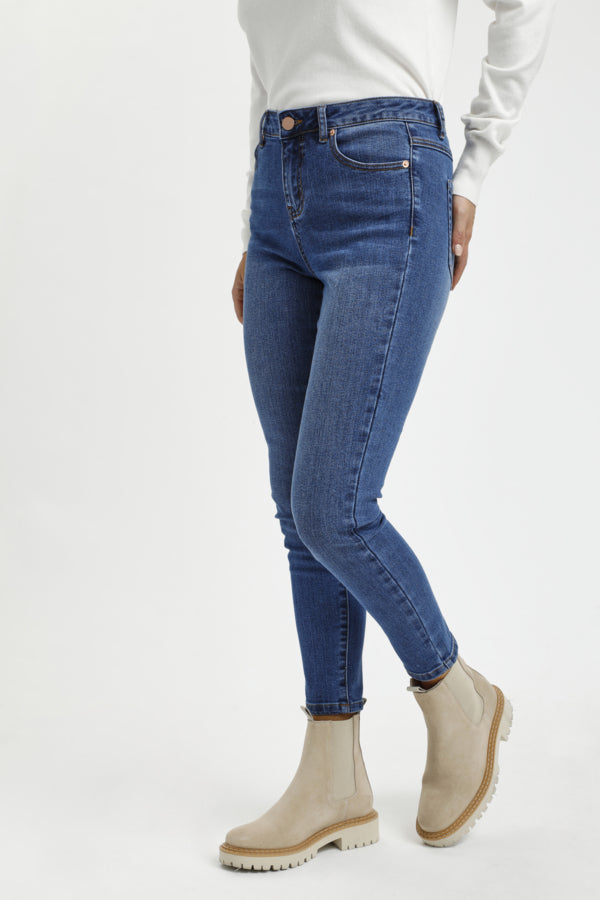 Klassiske smale jeans med ankellengde fra Kaffe Clothing. Kasinem dongeribukse er den perfekte hverdags buksa med høyt liv og smale bein. Velg din normale størrelse i denne buksa.