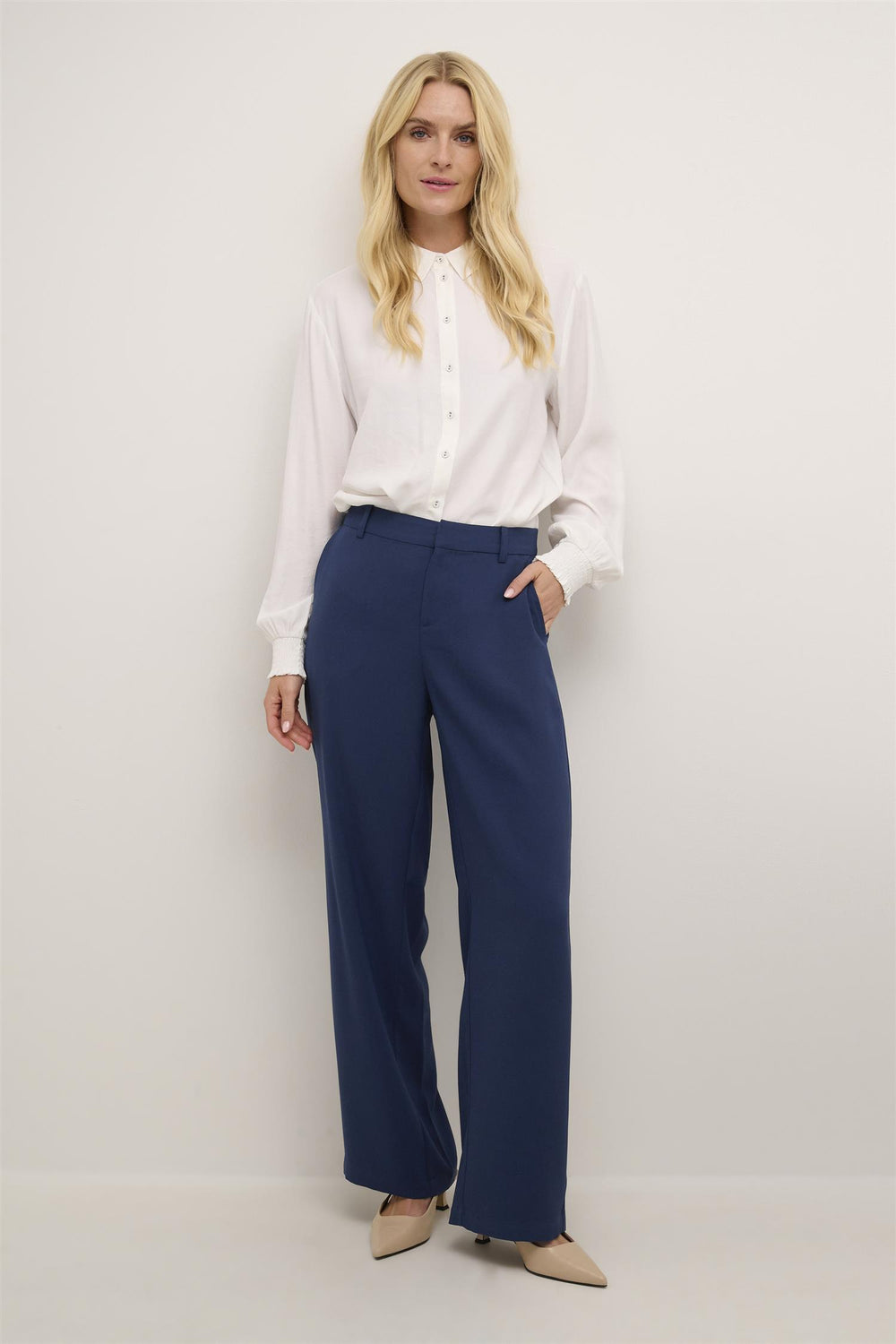 Lekker blå dressbukse fra Cream med elastisk midje og rette ben. Dette kan fort bli din nye favorittbukse. Klassisk og fin. Bruk den alene eller sett sammen med blazer i samme serie.
