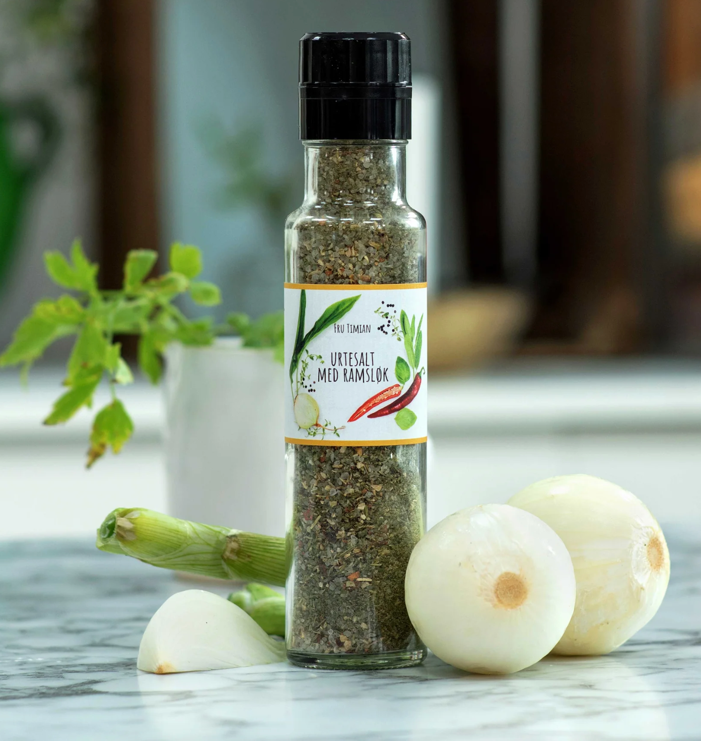Urtesalt med ramsløk kan virkelig lett bli en ny krydderfavoritt, for her er det mye god smak! Ramsløk blir ofte kalt Nordens hvitløk. Den vokser vilt mange steder her til lands og selv om smaken er forskjellig fra vanlig hvitløk, er den i samme kategori. Den er ganske skarp i smaken og fyller ut smaksbildet sammen med de andre urtene i denne blandingen så det blir en fyldig saltsmak.