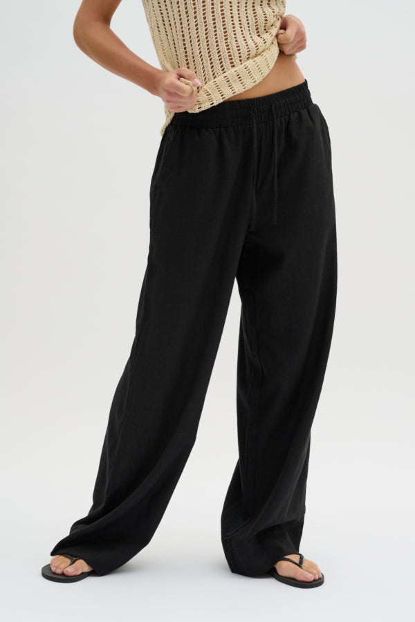 Dette er buksa som roper sommer, komfort og stil! Den svarte linbuksa har en avslappet passform som sitter løst og behagelig – akkurat sånn vi liker det. Med elastisk linning og knytebånd i livet er den superenkel å dra på seg, og minst like lett å style. Enten du skal på kafé, jobbe en travel dag eller rusle i sommervarmen, er denne buksa et safe valg.