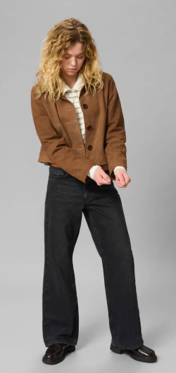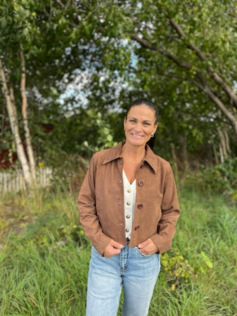 Designet har et kort, boxy snitt som gir en moderne silhuett, kombinert med klassiske detaljer som krage, store knapper og rette ermer. Den varme brune tonen passer perfekt til alt fra jeans og t-skjorte til en lett sommerkjole eller høstlag-på-lag look.