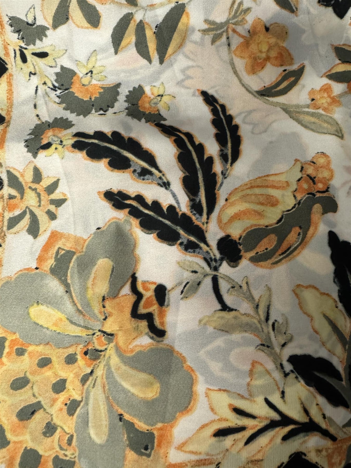 Fint bandana/skjerf med blomsterprint i varme gule og grå toner. Dekorativ kant gir en sofistikert ramme til designet. Perfekt å bruke rundt halsen, i håret eller som en fin detalj på vesken.