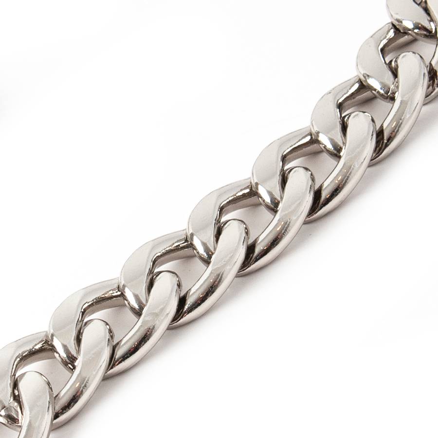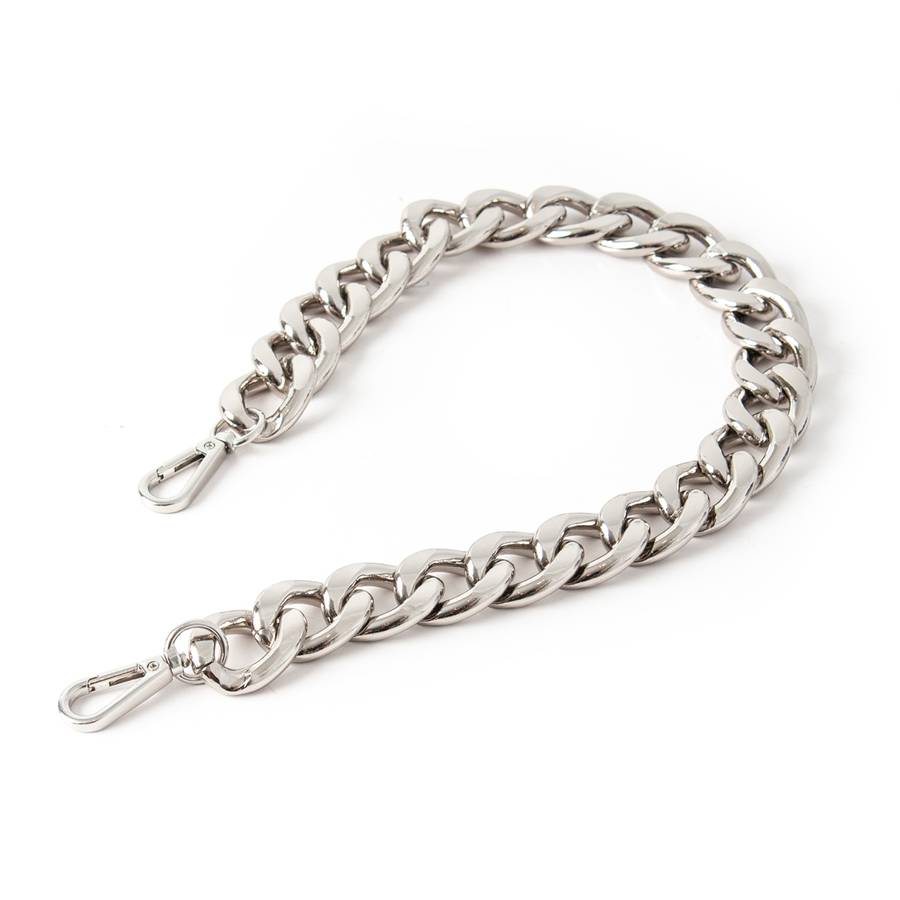 Sølvfarget lenke som skulderrem, festes med kroker. Metallet er laget i sølvfarget kobber.