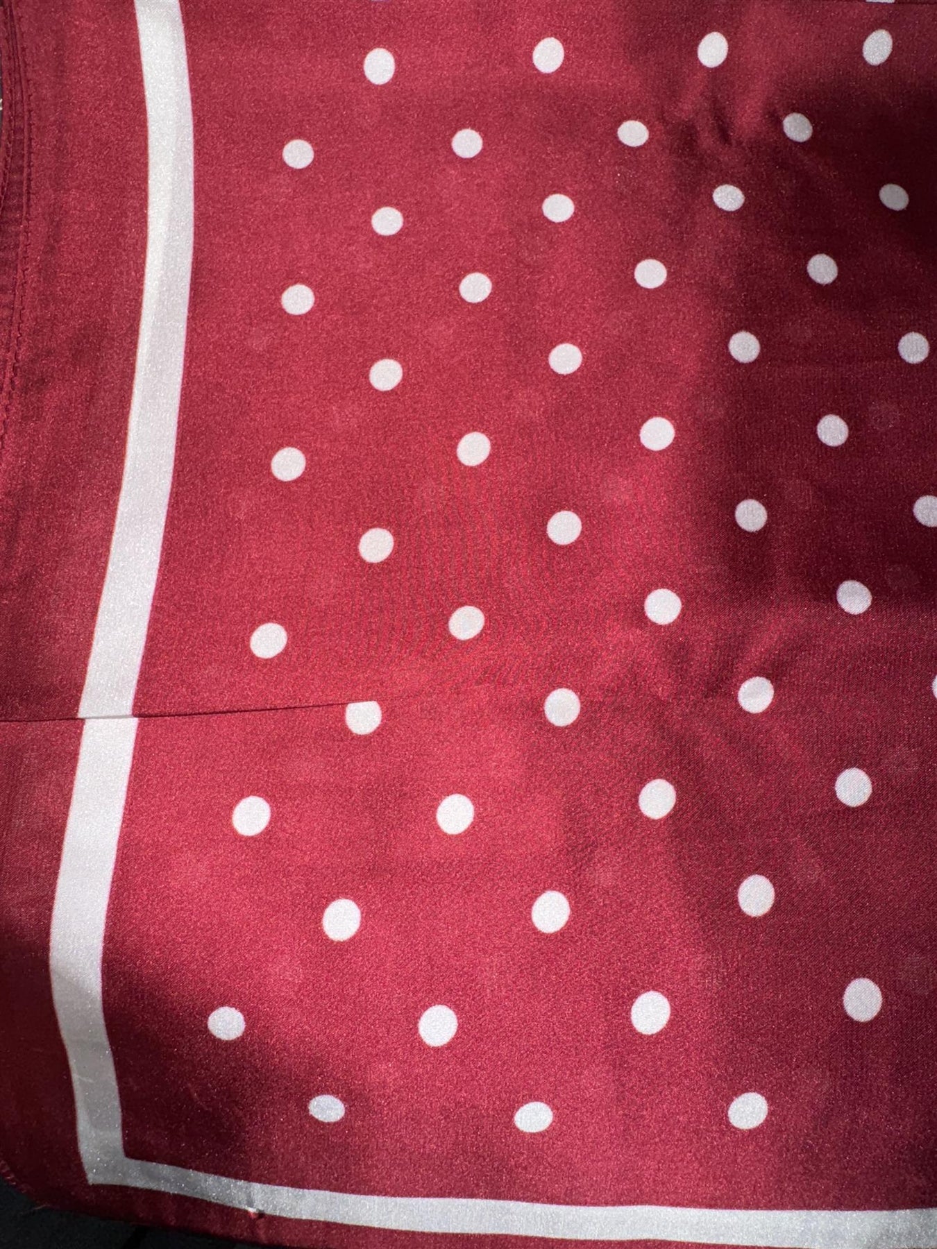 Bandana/skjerf med hvite prikker og hvit kant. Et lekent og tidløst design som gir antrekket et friskt løft. Bruk det som bandana, hårpynt, halsskjef eller knytt på vesken for en chic detalj.