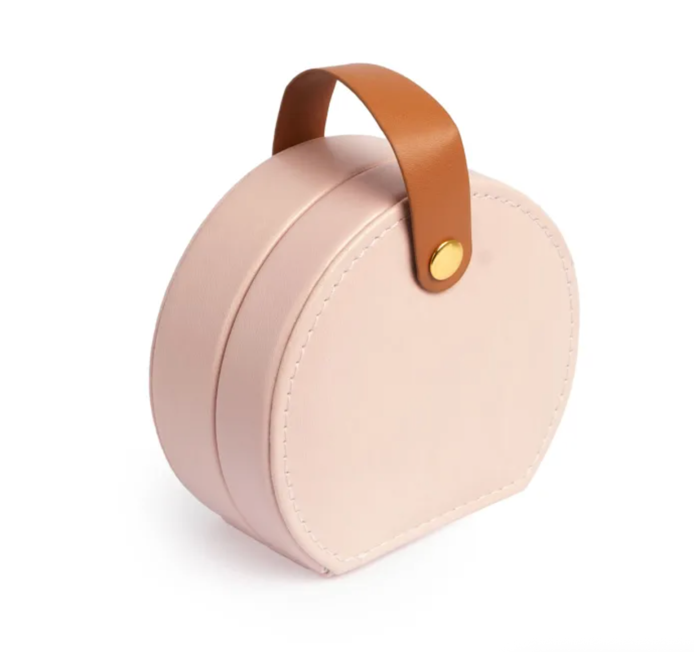 Hold orden på favorittsmykkene dine med denne fine, runde smykkeboksen i kunstskinn. Den er liten og nett – akkurat passe stor til å få plass i vesken eller kofferten, uten at smykkene dine blir flokete eller borte.