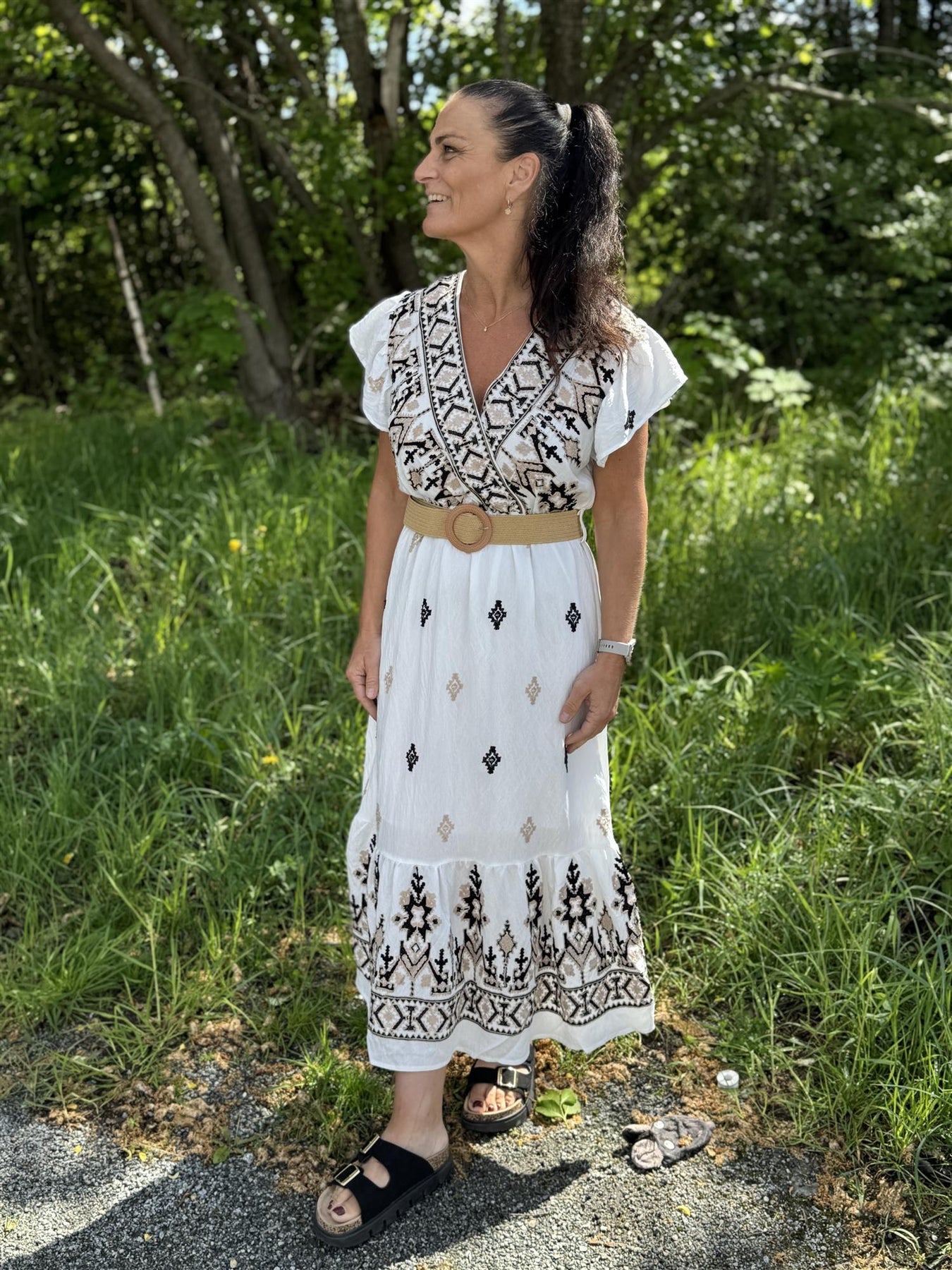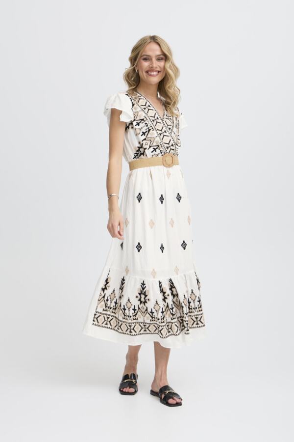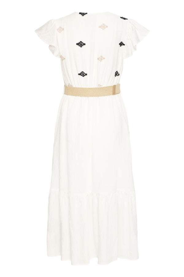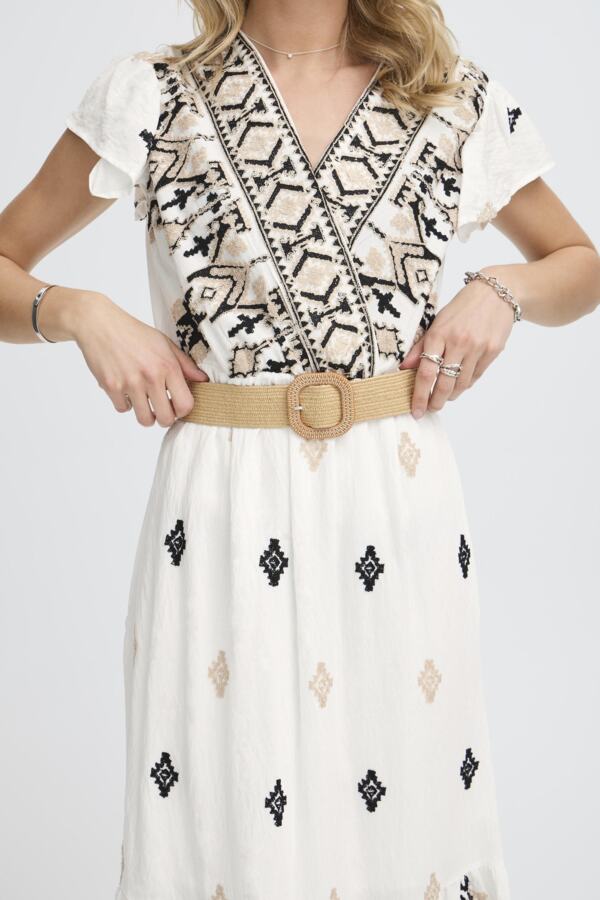 Den markerte midjen med et bredt, vevd belte med dekorativt spenne fremhever fasongen på en elegant og naturlig måte. V-hals og korte volang-ermer gir et luftig, feminint preg, perfekt til både hverdagsbruk og sommerlige festligheter.