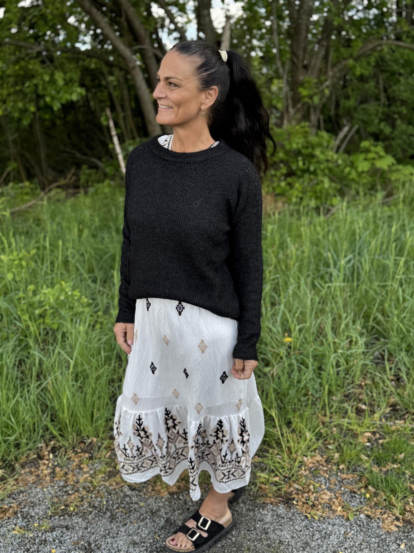 Denne kjolen blir lett din nye sommer favoritt! Laget i en lett og myk blanding av viskose og polyamid, gir den deg en behagelig og flatterende passform. Kjolen har et nydelig broderimønster foran og langs kanten nederst, som gir den et eksklusivt uttrykk – uten at det går på bekostning av komforten.