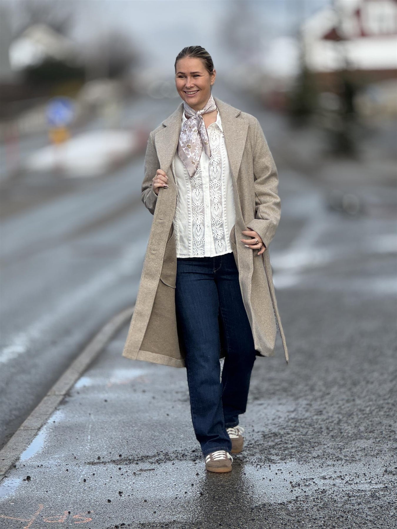 Dette er kåpen du tar frem år etter år. En klassisk, knelang kåpe med rene linjer, slagkrage og belte i livet som gir en pen og feminin silhuett. Den rette passformen gjør den enkel å style – like fin over kjole som til bukse og strikk.