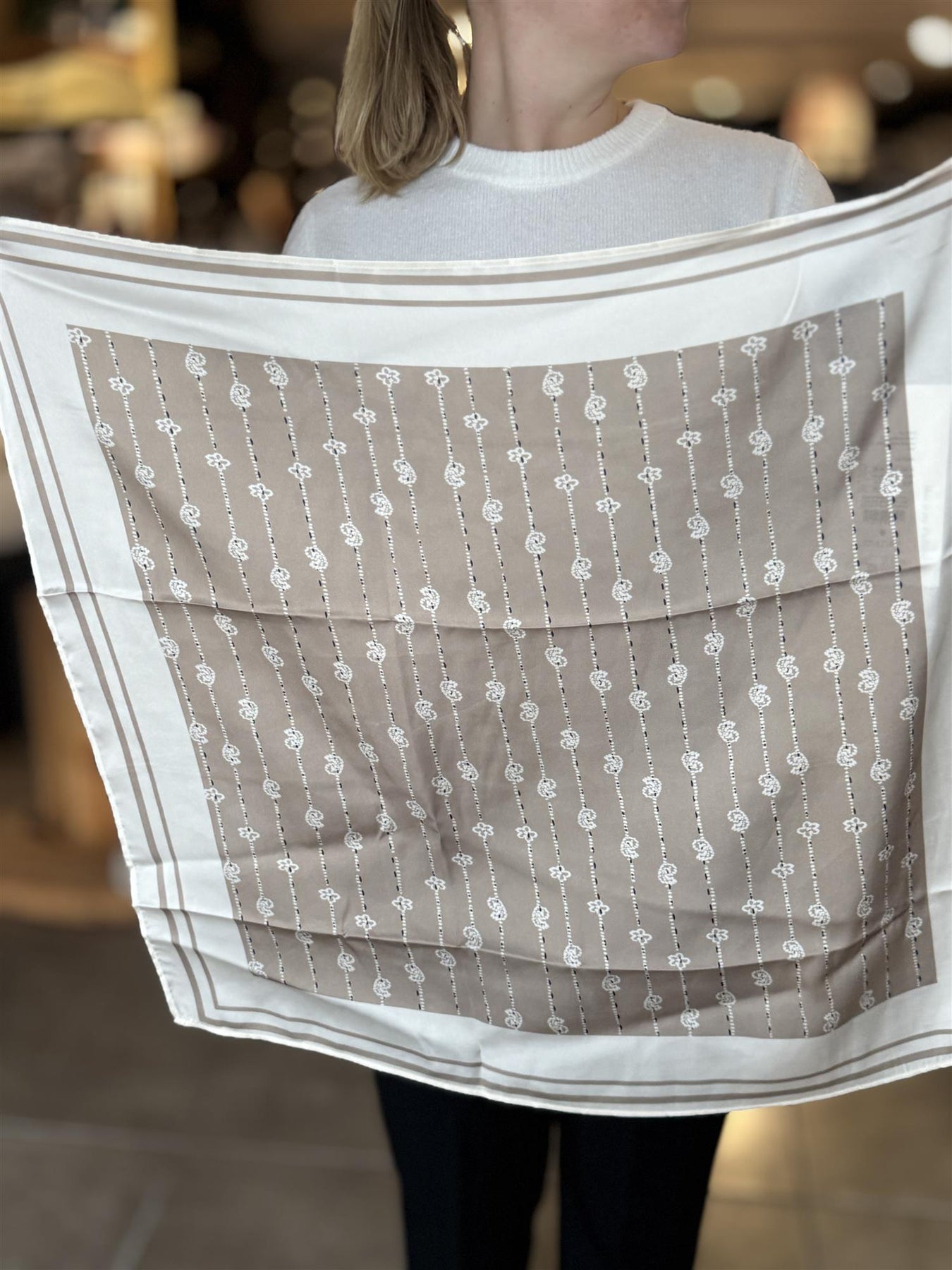 Dette fine bandana/skjerfet er et skikkelig humørboost til garderoben 🤎 Med sitt fine mønster og beige farger gir det antrekket det lille ekstra – enten du bruker det rundt halsen, i håret, på veska eller knyter det i livet slik bildene viser.