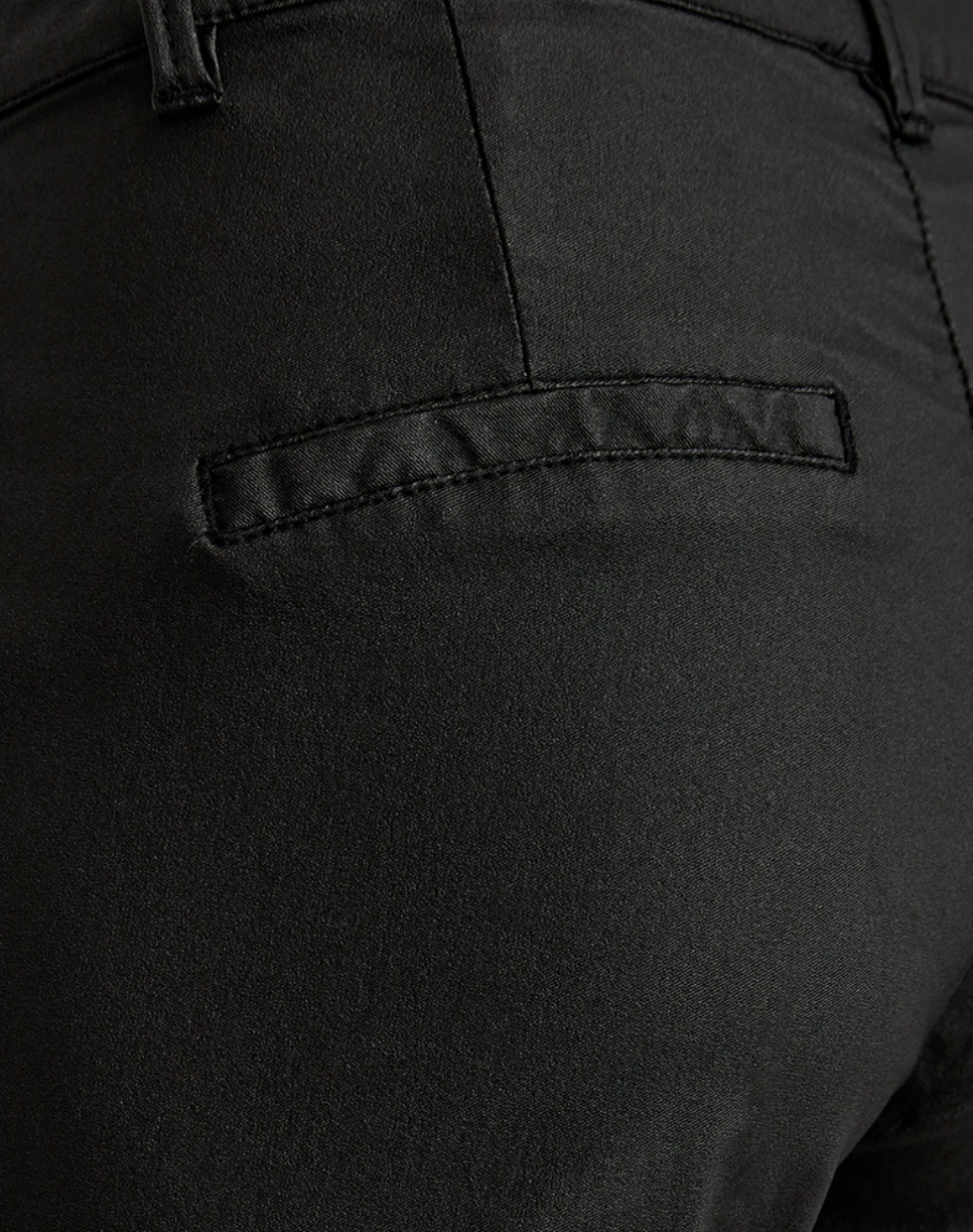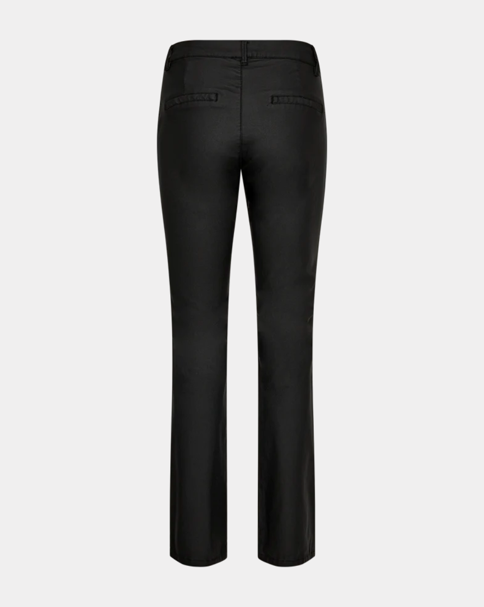 Bootcut-bukser fra Freequent i et coated materiale. Buksene har en enkel silhuett med glidelås og knappelukking, sidelommer, høyt liv og en skinny passform.