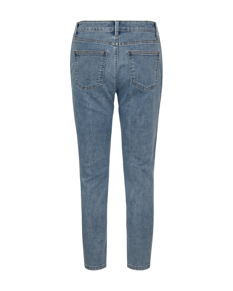 Klassisk smal jeans fra Freequent med veldig god stretch! Sitter godt i opp i livet, har stikklommer, baklommer og beltehemper. God fasong til dame. Anbefaler å gå NED i størrelse da buksen har god stretch!