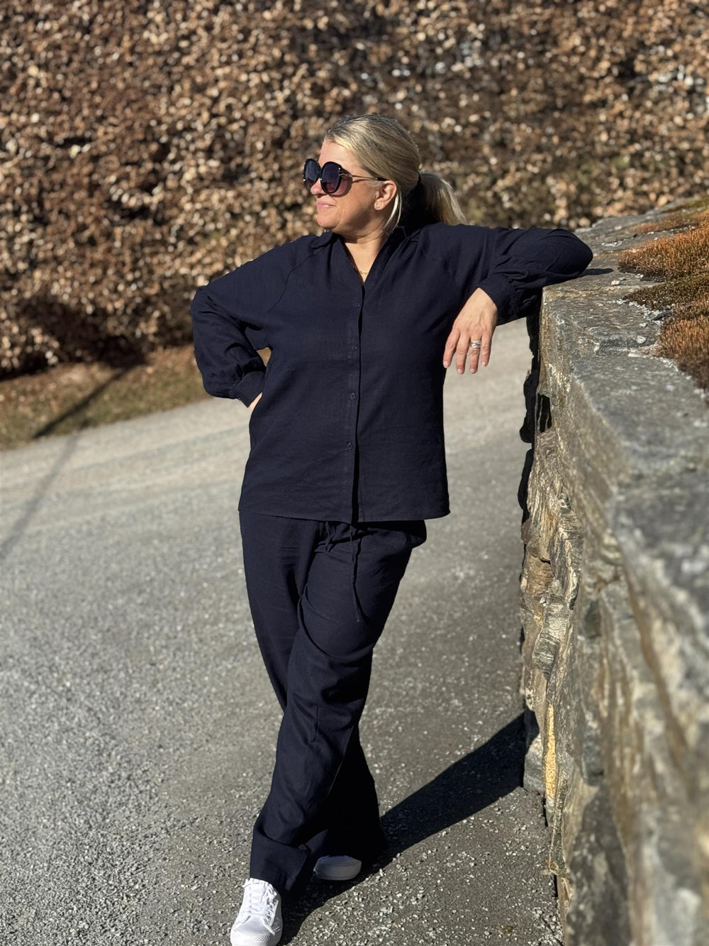 Linda har på seg størrelse L og har en bystemål på 110 cm. Skjorta har en normal til romslig passform. Om du vipper mellom to størrelser, anbefaler vi at du går ned en størrelse for en mer tilpasset look – Linda passer for eksempel også fint i M. Foretrekker du en oversized stil? Da kan du velge din vanlige størrelse for en avslappet passform