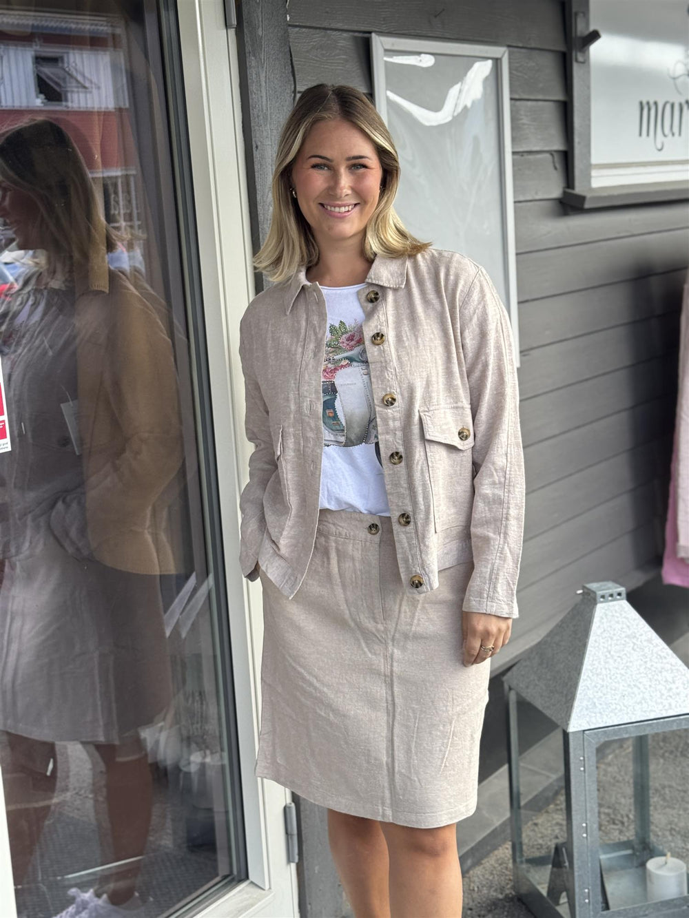 Dette klassiske linkjørtet fra Freequent er et must i sommergarderoben! Med sitt tidløse snitt, lette linblanding og praktiske lommer er dette skjørtet både behagelig, anvendelig og flatterende.
